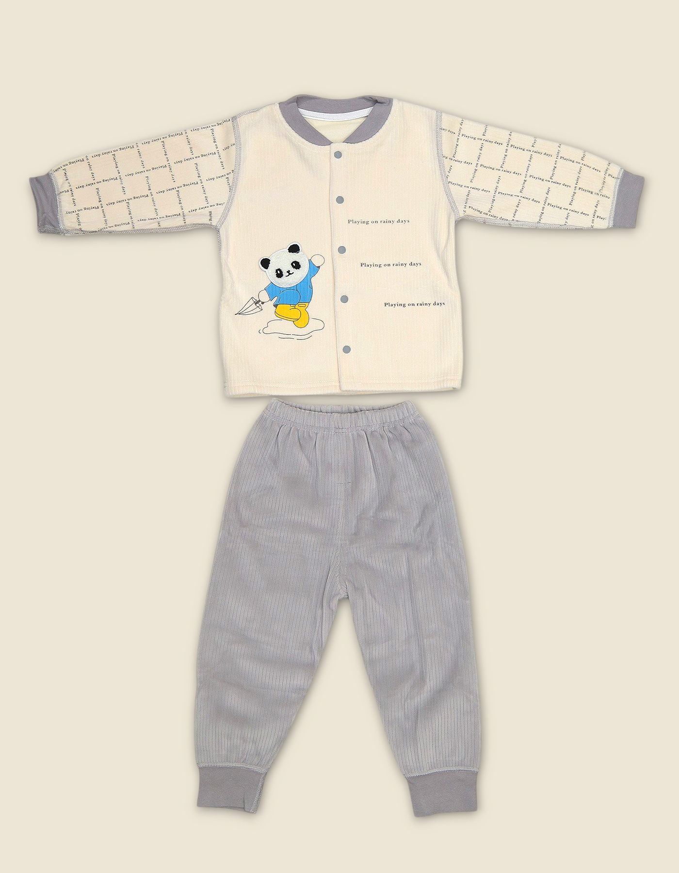 Soft boys pajama set with cartoon panda and rainy day theme. Perfect for bedtime comfort and gifting