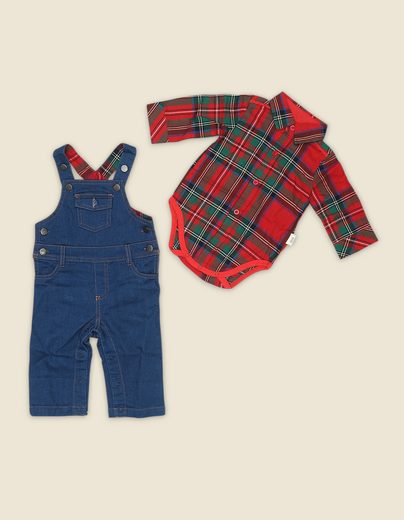 A cute boys outfit featuring a red plaid long sleeve shirt and a matching blue denim dungaree set. Comfortable, durable, and perfect for chilly days.
