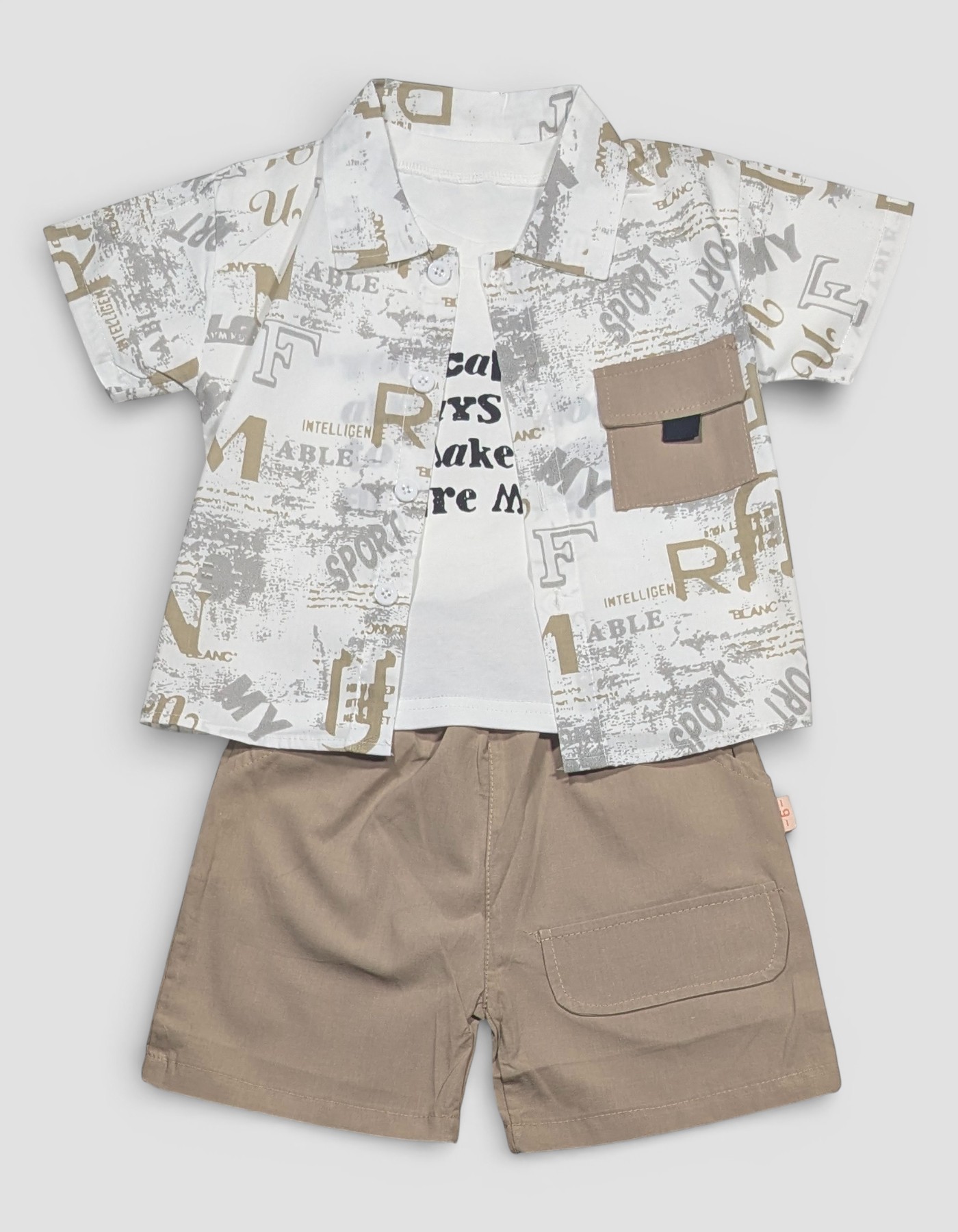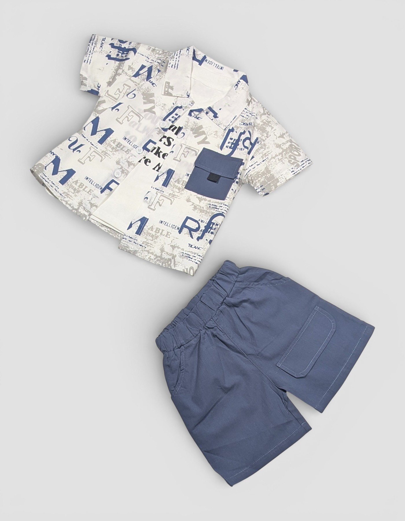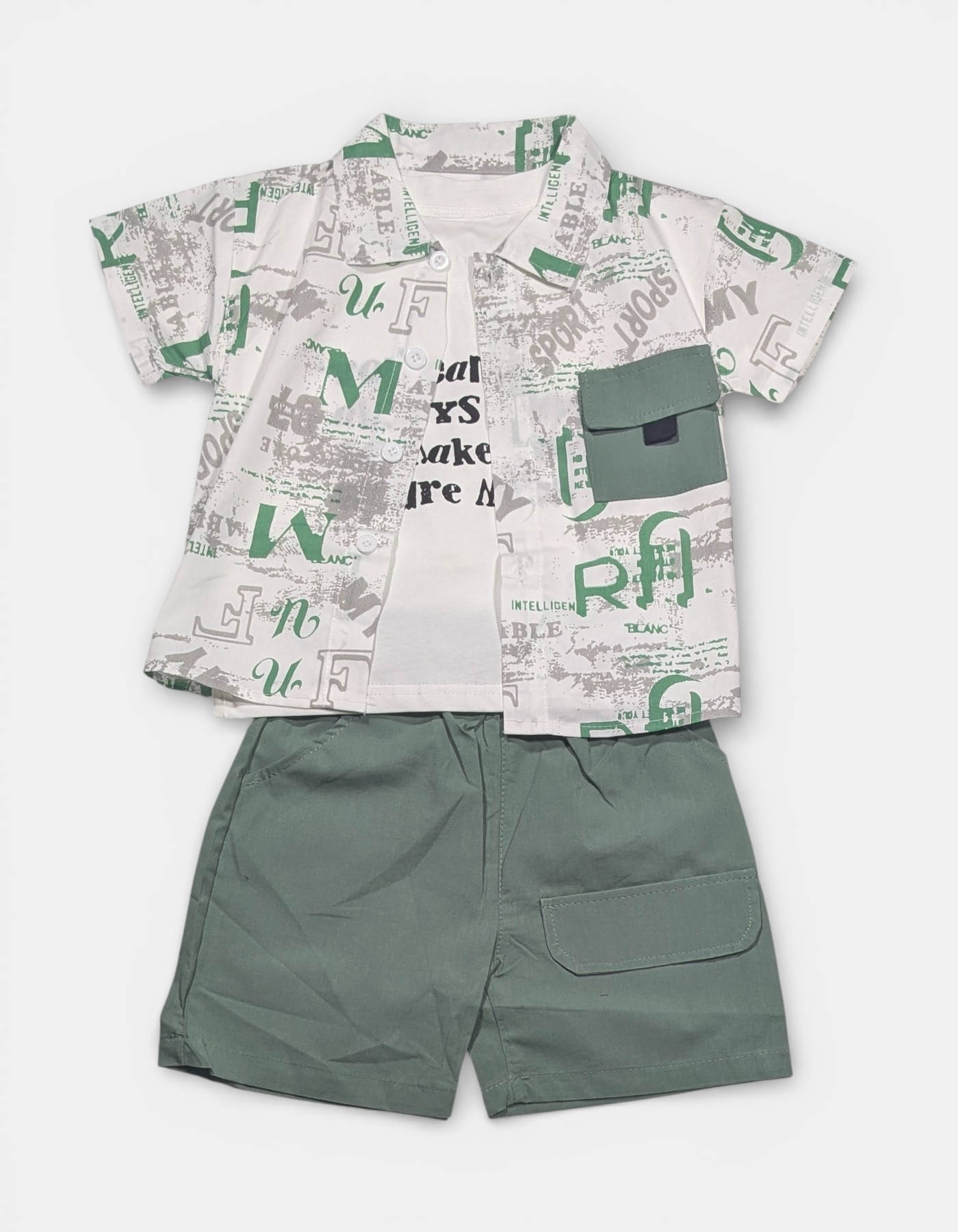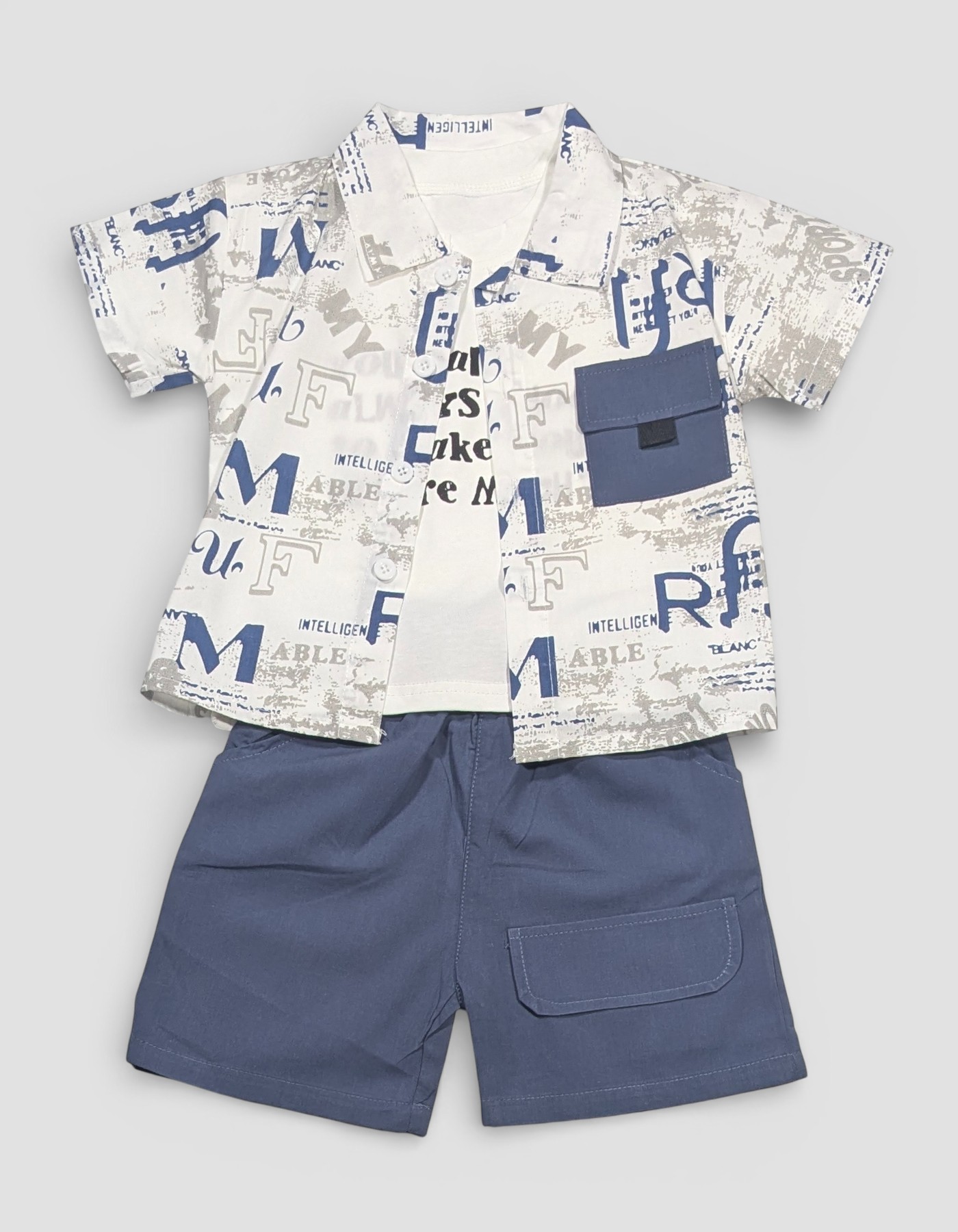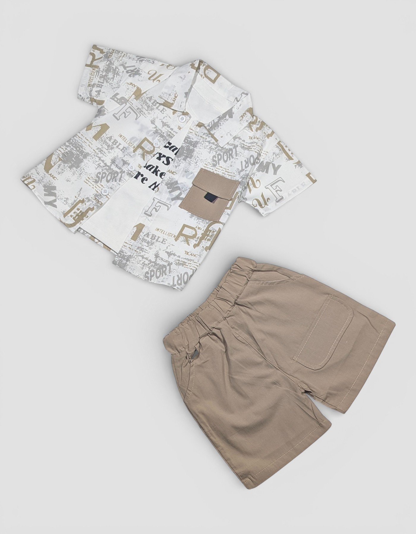 Boys Stylish Printed Shirt & Shorts Set Upgrade your little one’s wardrobe with this trendy boys’ shirt and shorts set, designed for everyday comfort and standout style. The set features a smart printed half-sleeve shirt layered over a soft inner tee, paired with matching solid-color shorts for a complete, coordinated look. Crafted from breathable, skin-friendly fabric, this outfit keeps your child comfortable all day long—perfect for playtime, outings, parties, or casual wear. The modern graphic print, contrast chest pocket, and neat button-down design add a fashionable touch, while the relaxed-fit shorts ensure easy movement.