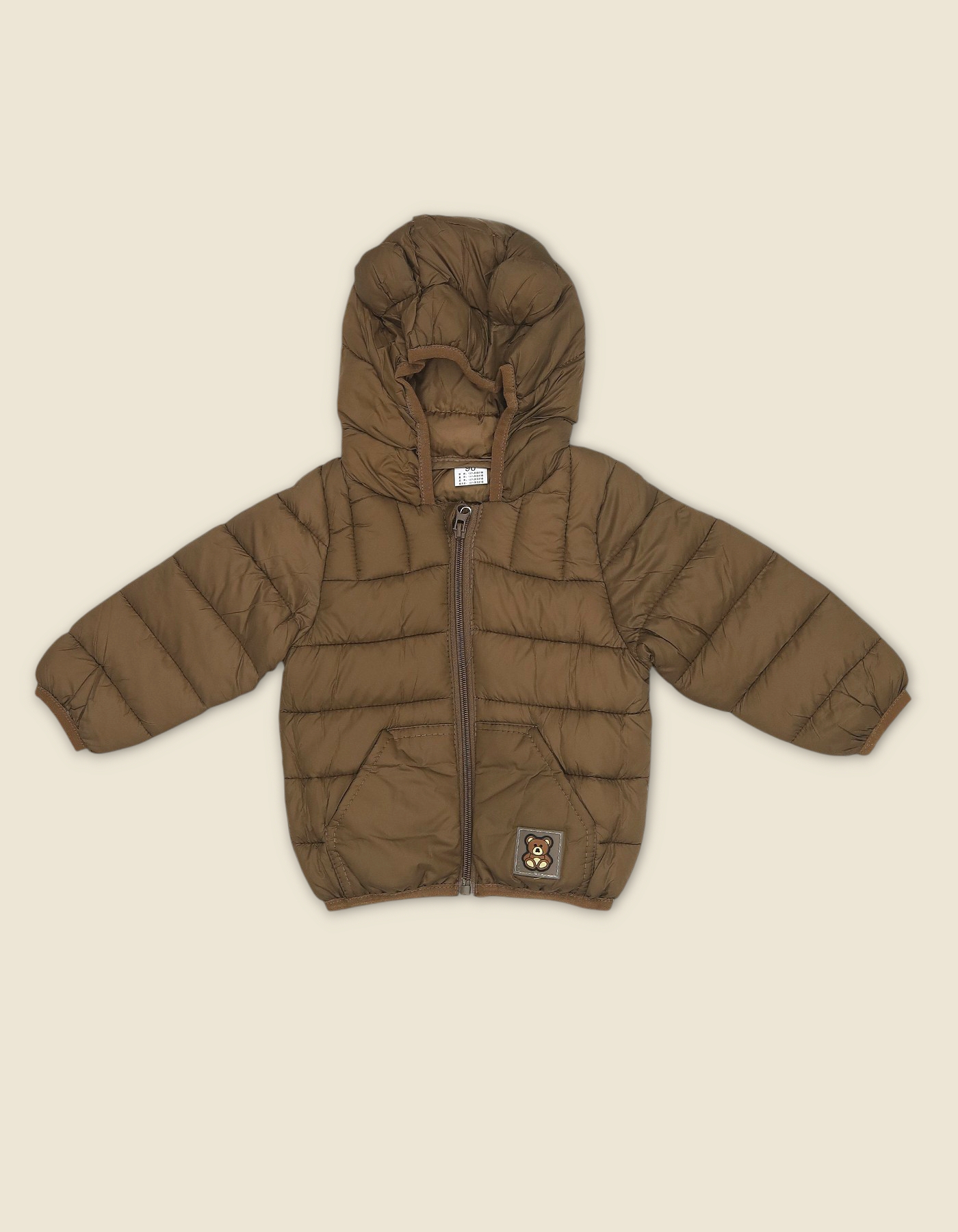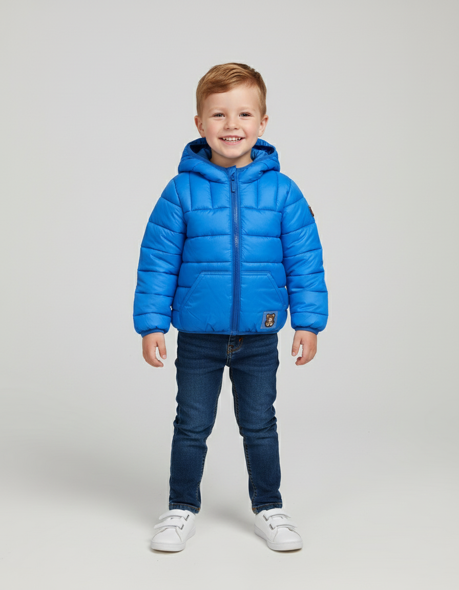 Warm boys puffer jacket with bear patch and quilted design. Perfect for winter wear and gifting
