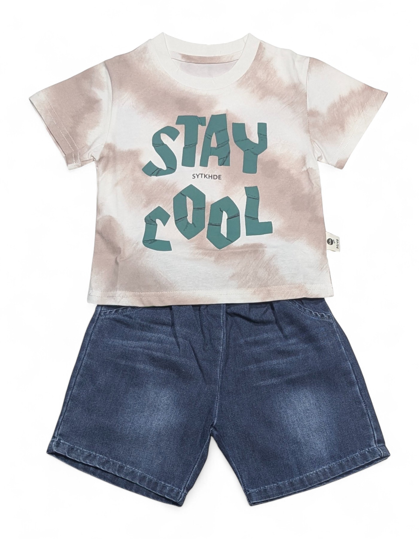 Boys “Stay Cool” Printed T-Shirt & Denim Shorts Set Keep your little one looking stylish and feeling comfortable with this trendy two-piece outfit set. Featuring a soft tie-dye effect T-shirt with a bold “Stay Cool” graphic and classic denim-style shorts, this set is perfect for everyday wear. The breathable fabric and relaxed fit make it ideal for warm weather and active play.