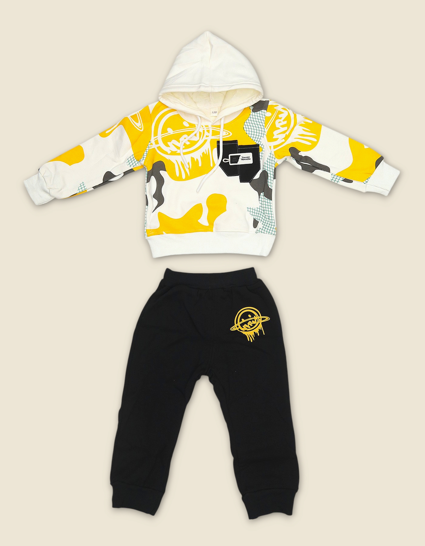 Bold boys suit with abstract hoodie and ACM planet print pants. Perfect for casual wear and gifting