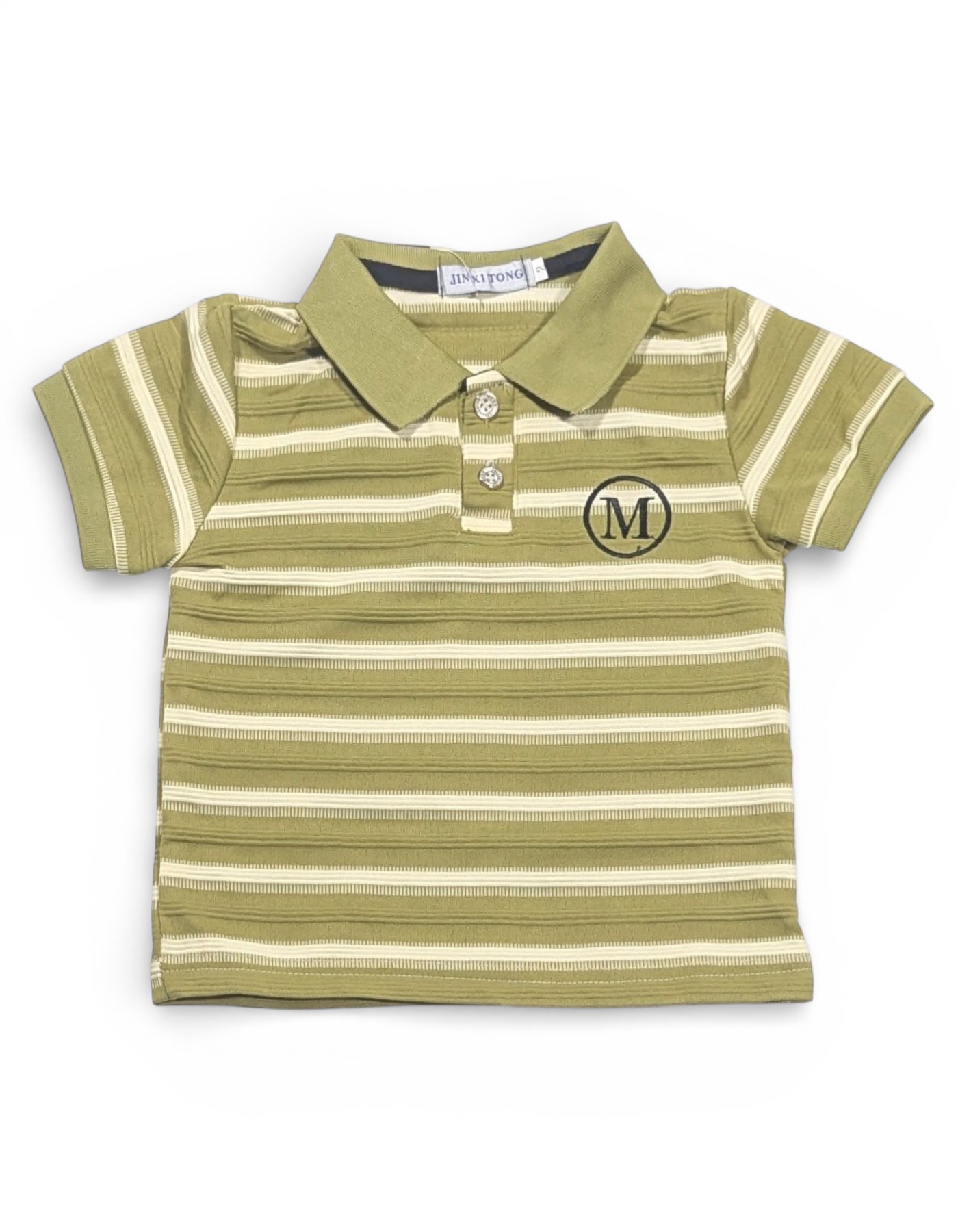 A classic and sporty look for your little boy. This olive green shirt has clean white stripes and a cool circular logo on the chest.