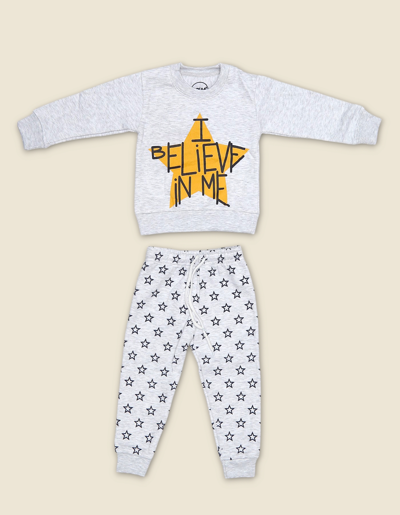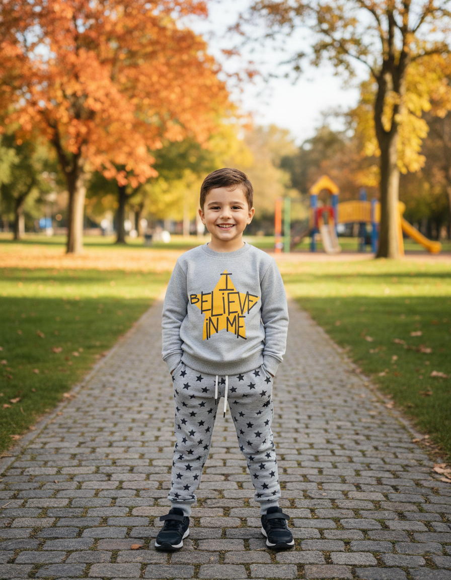 Stylish boys track suit with motivational graphic sweatshirt and printed pants. Perfect for casual wear playtime and gifting