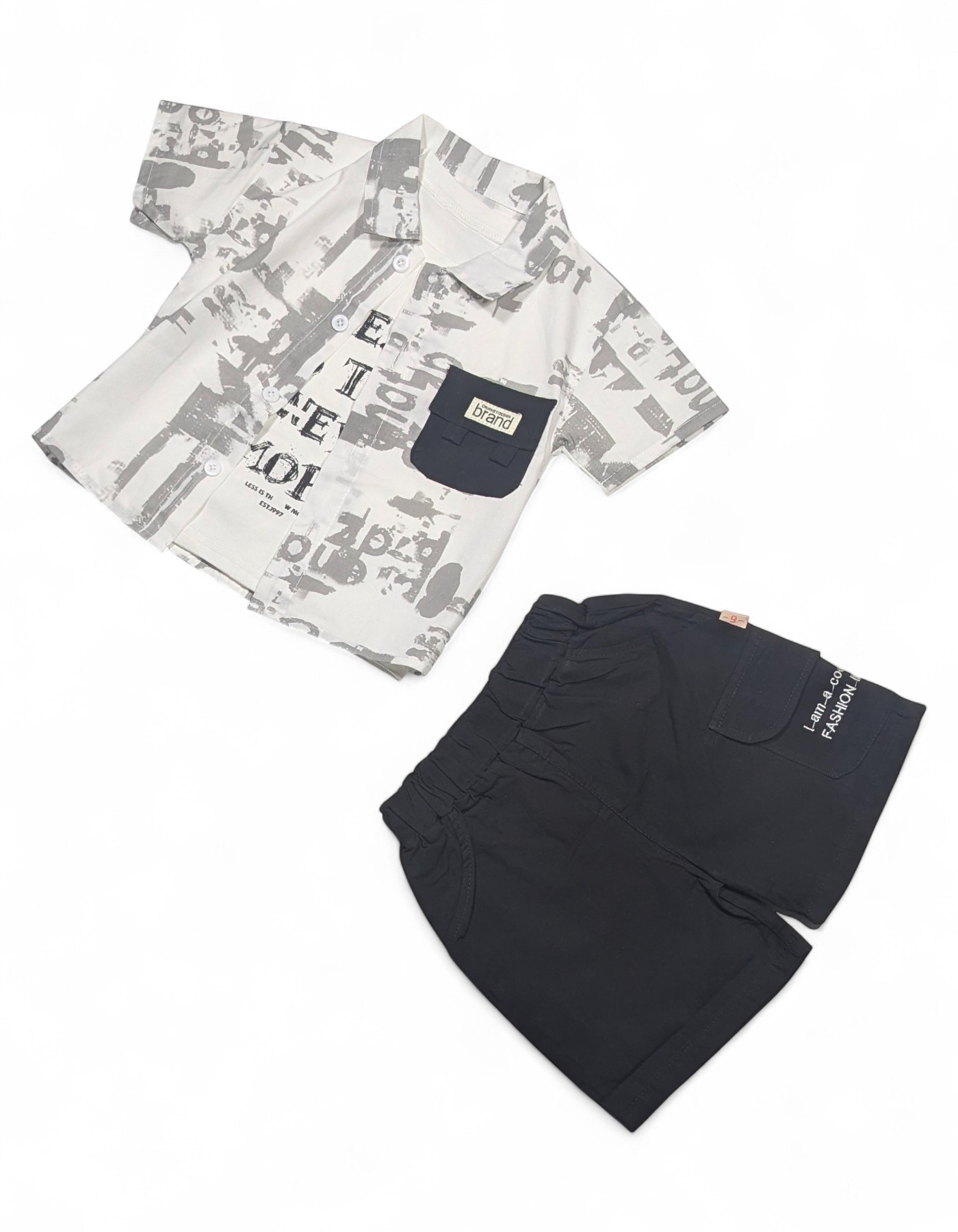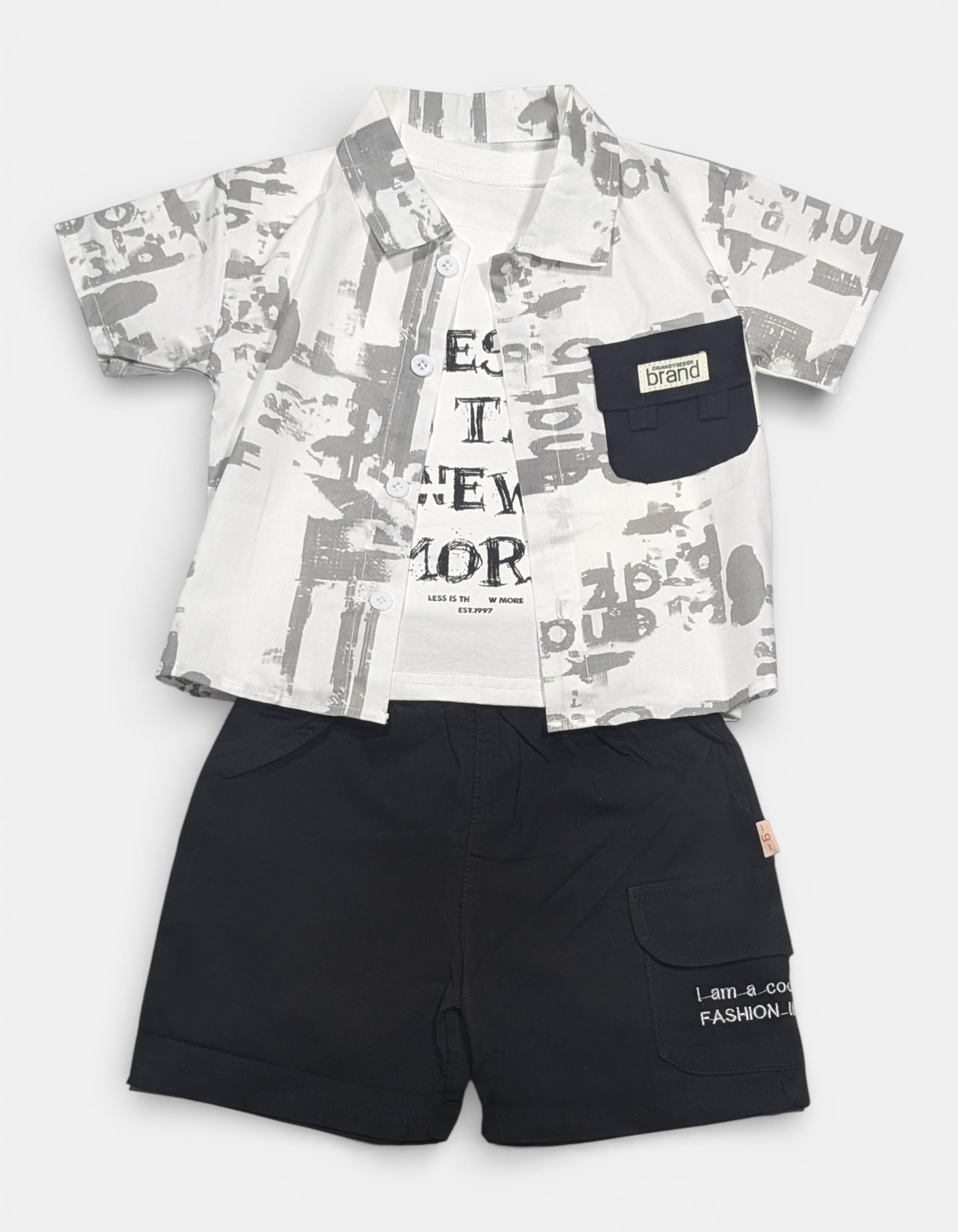 Give your little one a cool, layered look with this stylish boys’ casual suit, designed for comfort and everyday fashion. This trendy 3-piece set includes a printed short-sleeve button-down shirt, a soft graphic T-shirt, and solid black shorts for a modern, street-style vibe. The contrast chest pocket and unique print add a fashionable edge, making this outfit stand out. Made from lightweight, breathable, and skin-friendly fabric, this suit ensures all-day comfort while allowing easy movement. Perfect for casual outings, playdates, parties, or summer wear, it’s a versatile and smart choice for your boy’s wardrobe.