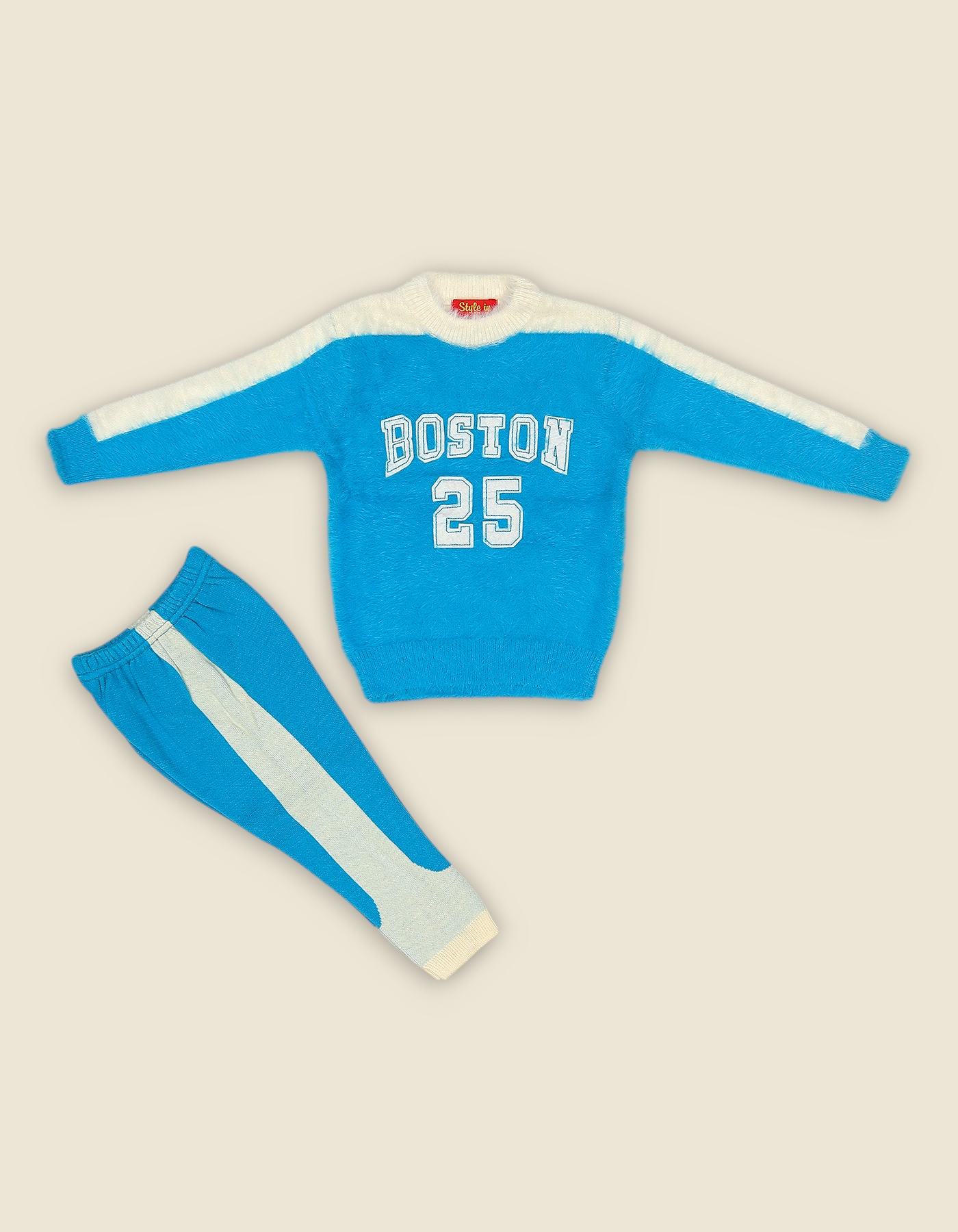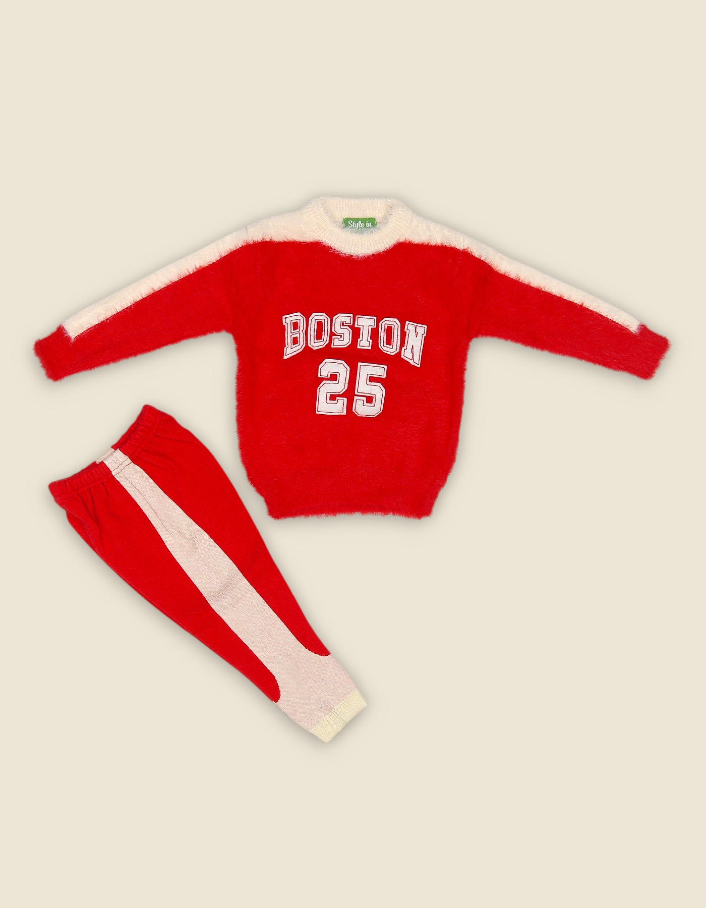 Sporty boys woolen suit with bold Boston design. Includes warm sweater and matching pants. Perfect for winter wear outings and gifting