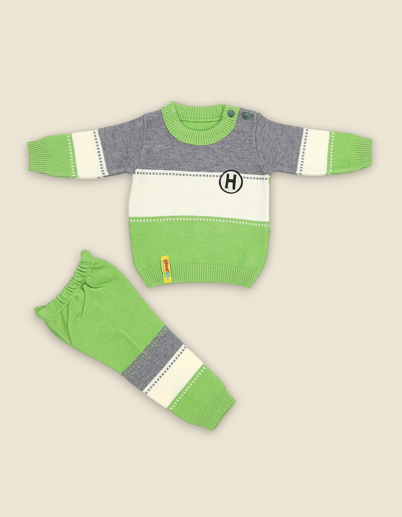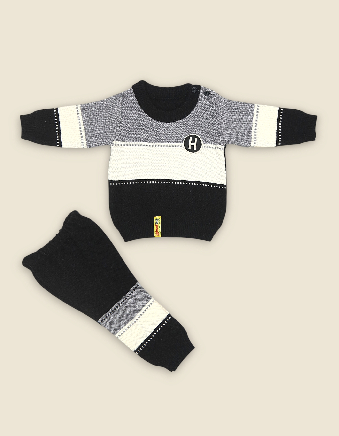Stylish boys woolen suit with color block sweater and matching pants. Perfect for winter wear outings and gifting