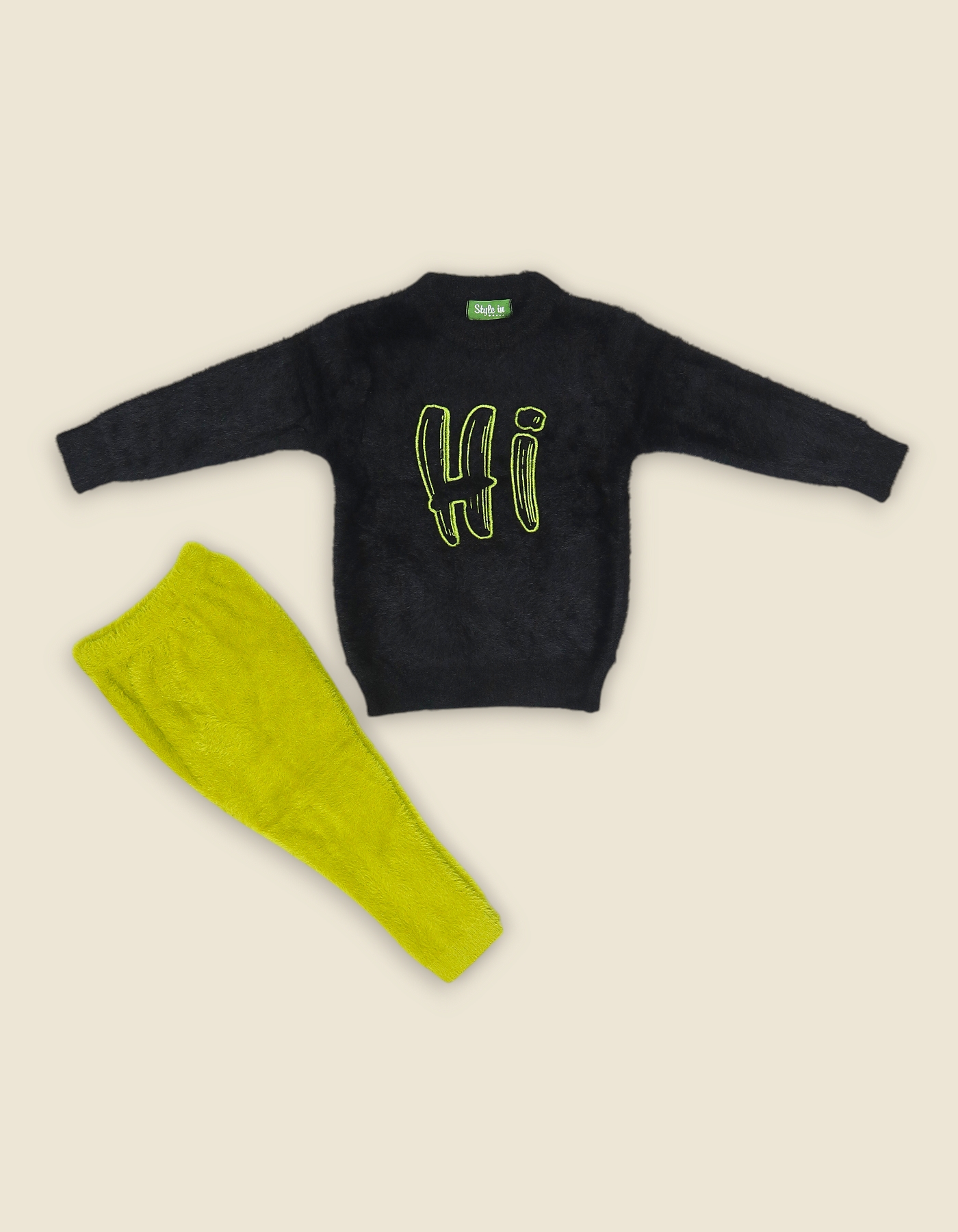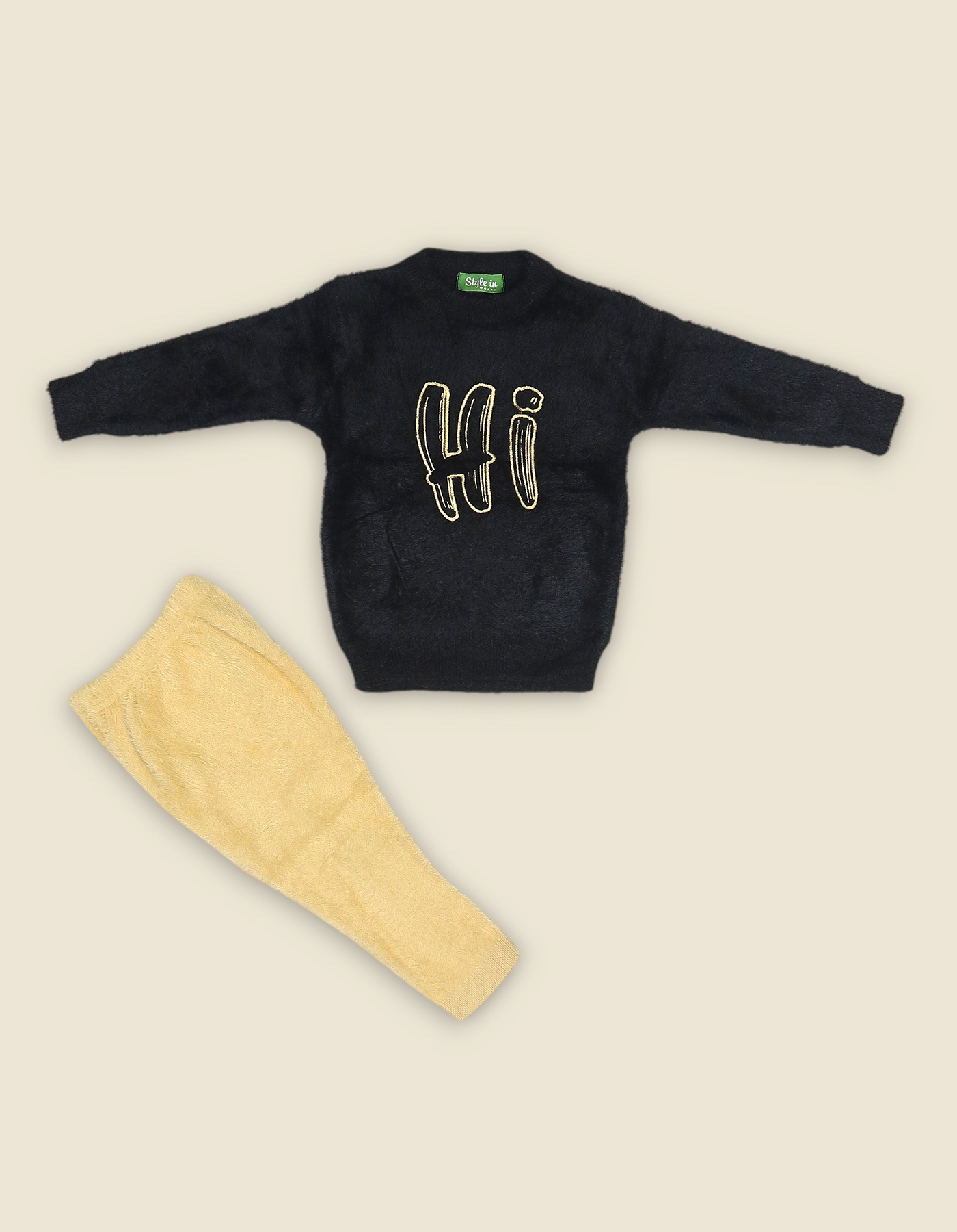 Cozy boys woolen suit with printed sweater and matching pants. Perfect for winter wear outings and gifting