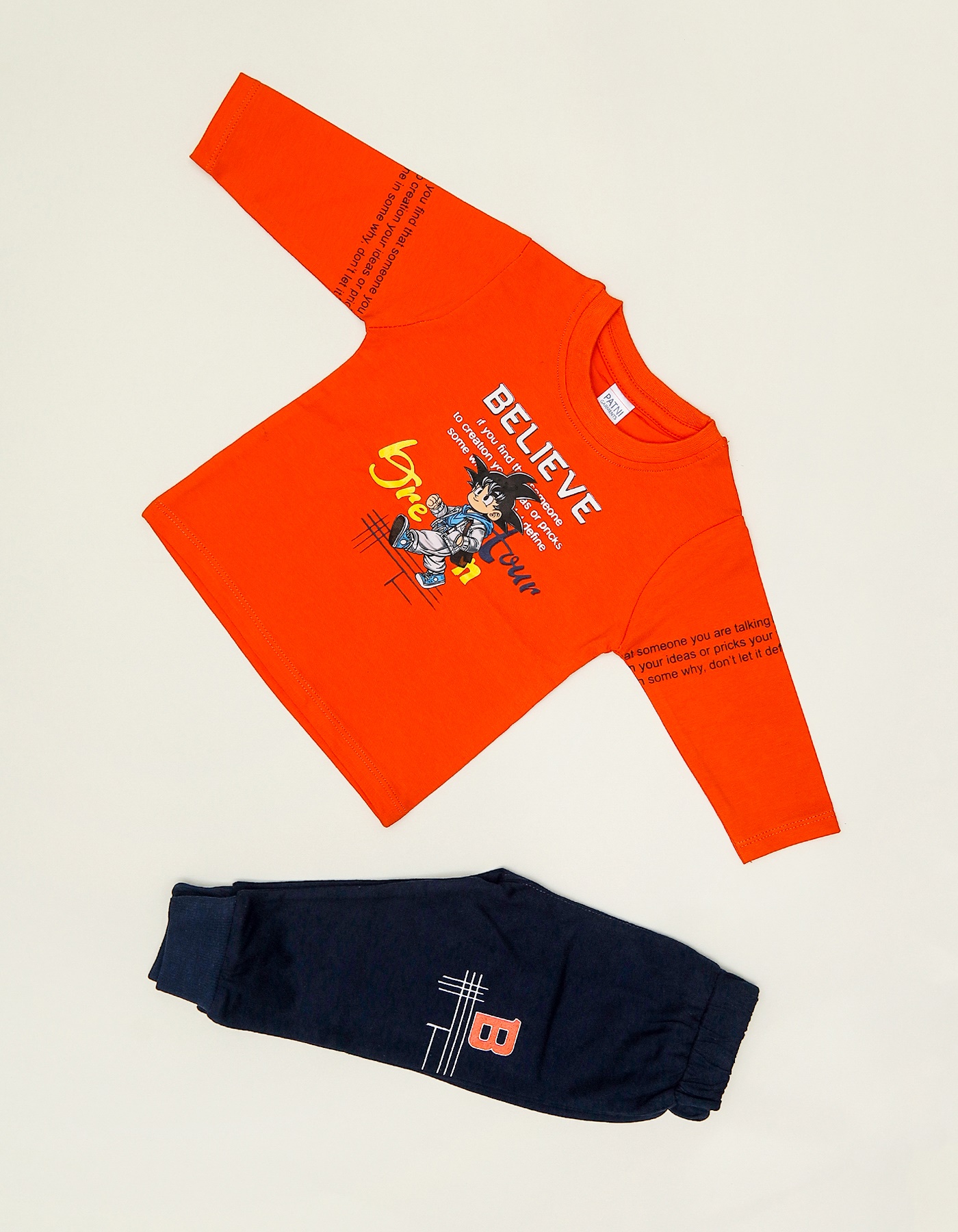 A bright orange long-sleeve tee featuring a cartoon character and inspirational text, paired with navy jogger pants that have a decorative letter motif. A bold, comfortable, and coordinated kids outfit.