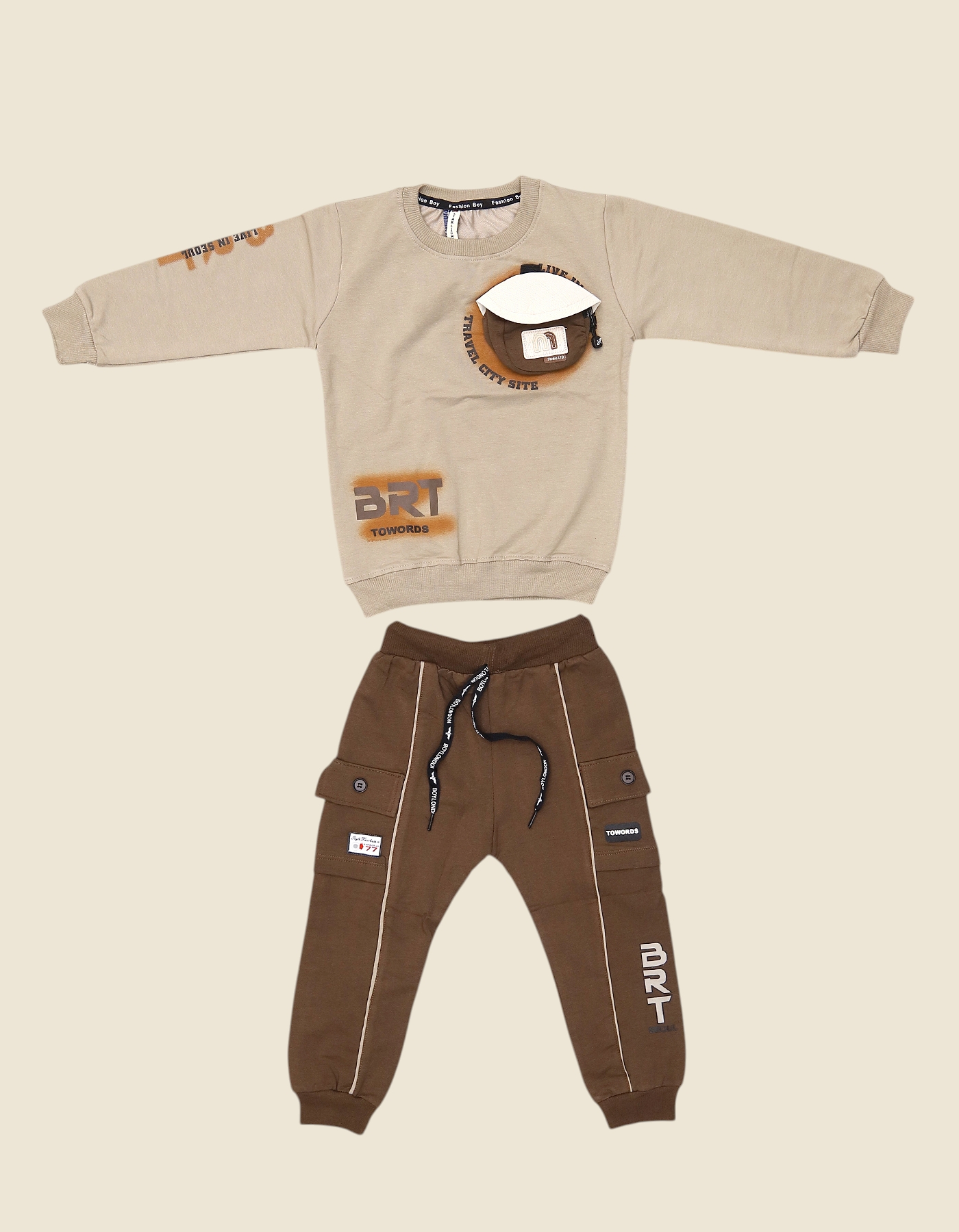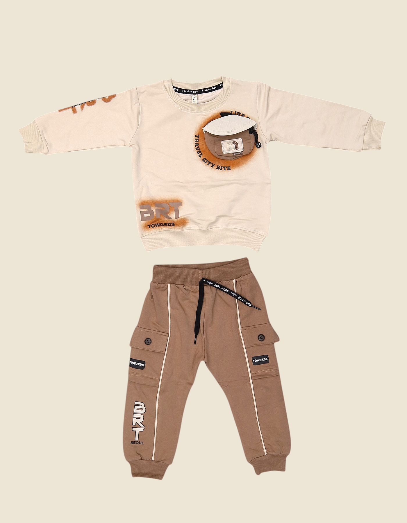 Keep your boy comfortable and stylish with this modern 2-piece cargo-style outfit. The set includes a trendy sweatshirt with a unique chest pocket detail and coordinating jogger pants with cargo pockets. Designed with the bold BRT Travel City graphic, this outfit is perfect for casual outings, playtime, or everyday wear. Available in brown, cream white, and grey tones for versatile styling.