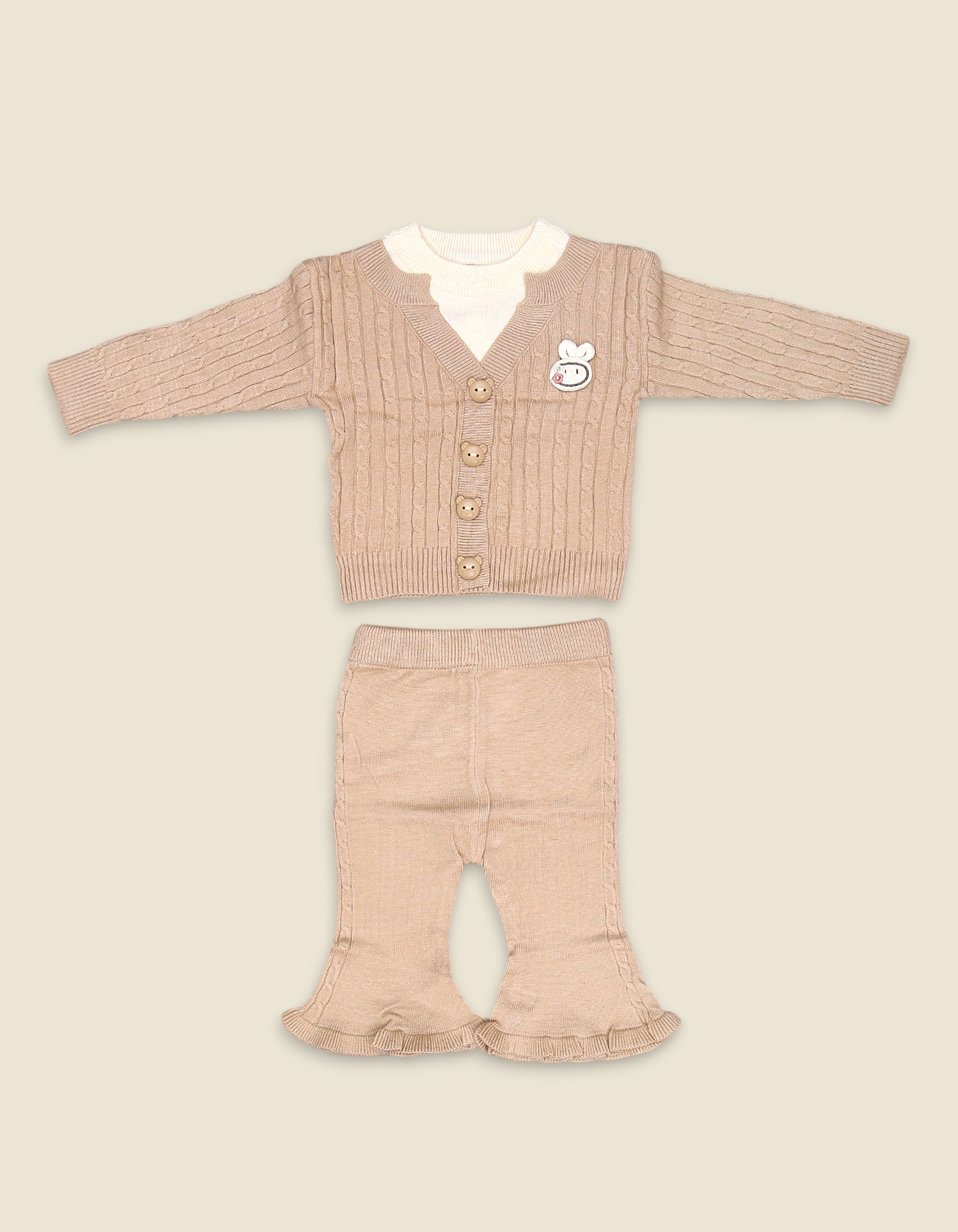 The Bunny Button Skin Woolen Suit is a cozy and elegant winter outfit that combines comfort with playful charm. This 2-piece set includes a skin-toned cardigan featuring cable-knit design, bear-shaped buttons, and a cute bunny patch, paired with matching pants that have ruffled hems for a stylish finish. Crafted from a soft wool blend, this outfit provides warmth, breathability, and durability, making it ideal for daily wear and winter outings. The V-neck cardigan with button-down closure ensures easy dressing, while the elastic waistband pants offer flexibility and comfort for active little ones. Perfect for family gatherings, casual outings, or festive occasions, this woolen suit is both adorable and practical.