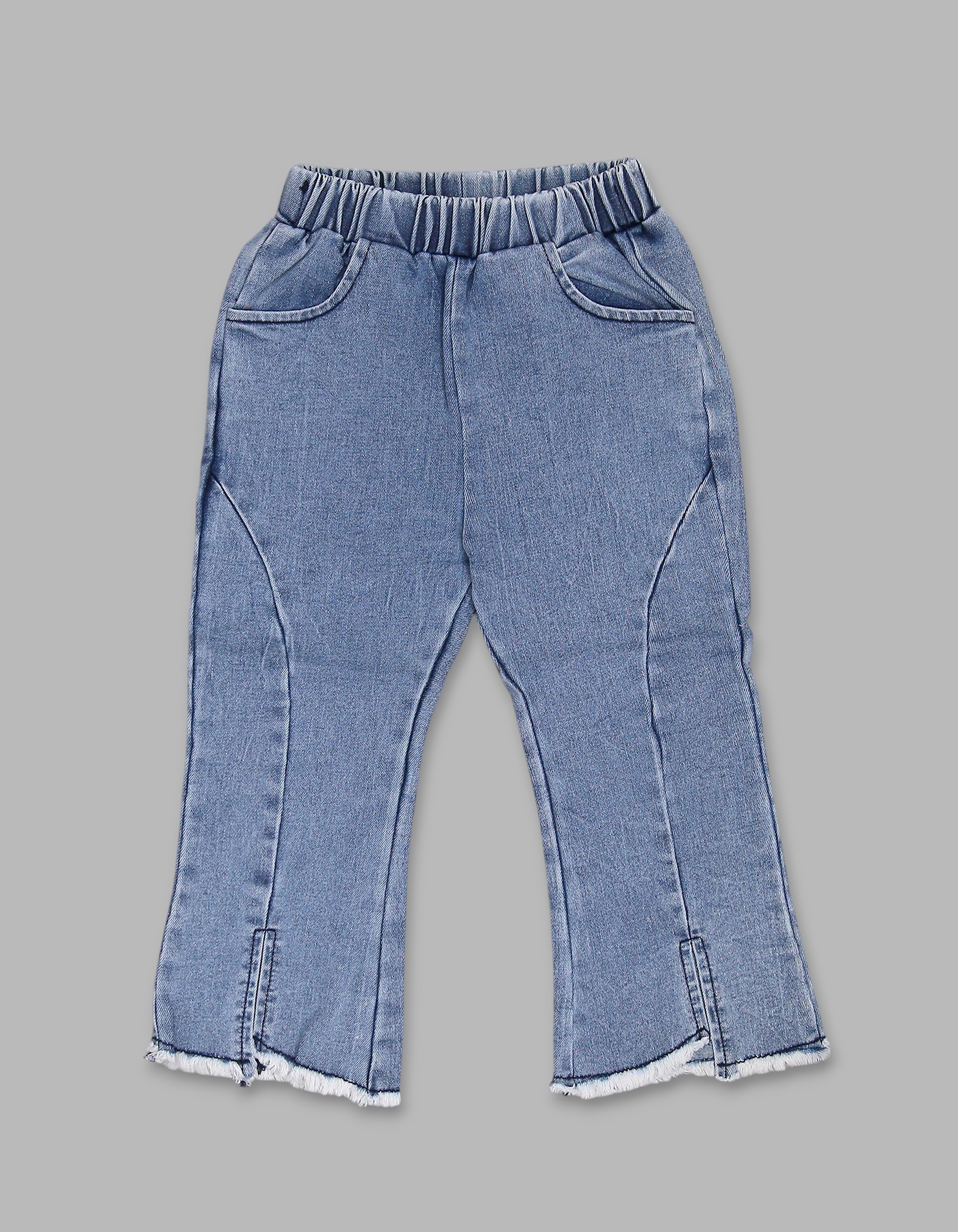 Trendy Denim Pants – Elastic waistband with flare and frayed hems.