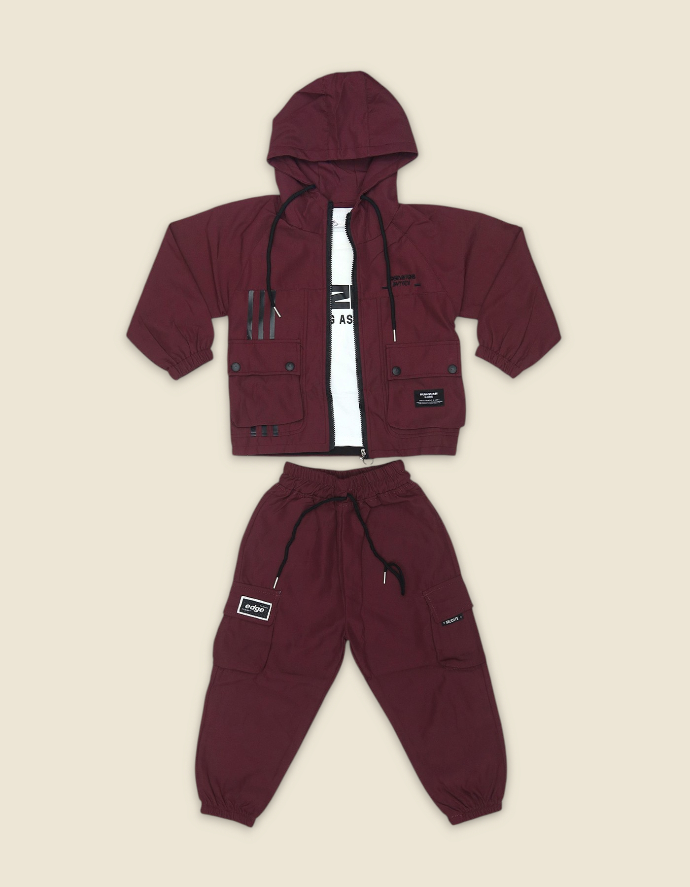 Three piece kids outfit with a hooded zip jacket, a white printed tee, and burgundy cargo jogger pants. Sporty utility details, elastic cuffs and waist, and contrast black drawcords for an on trend look that is comfortable for everyday play.
