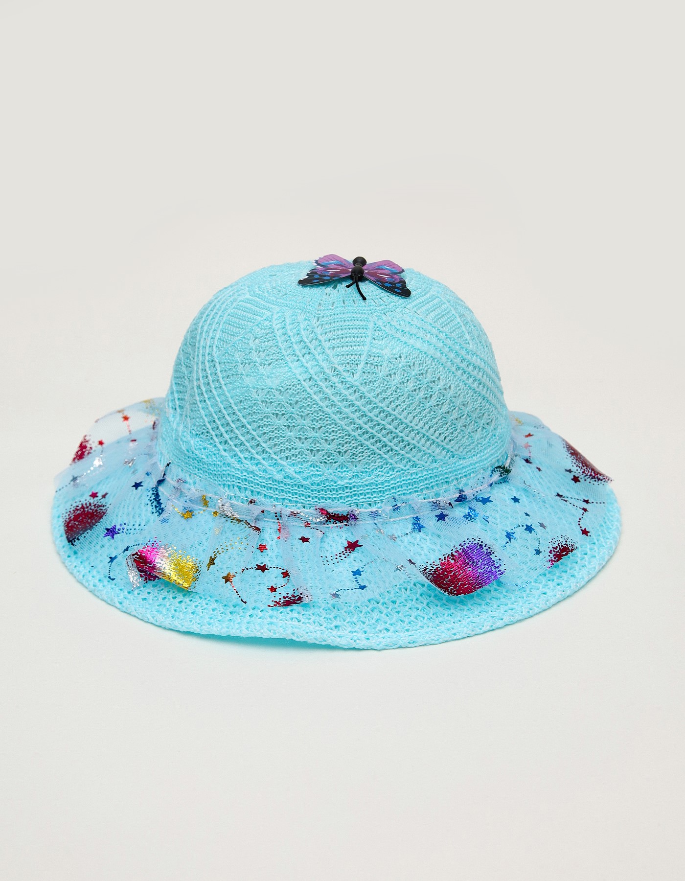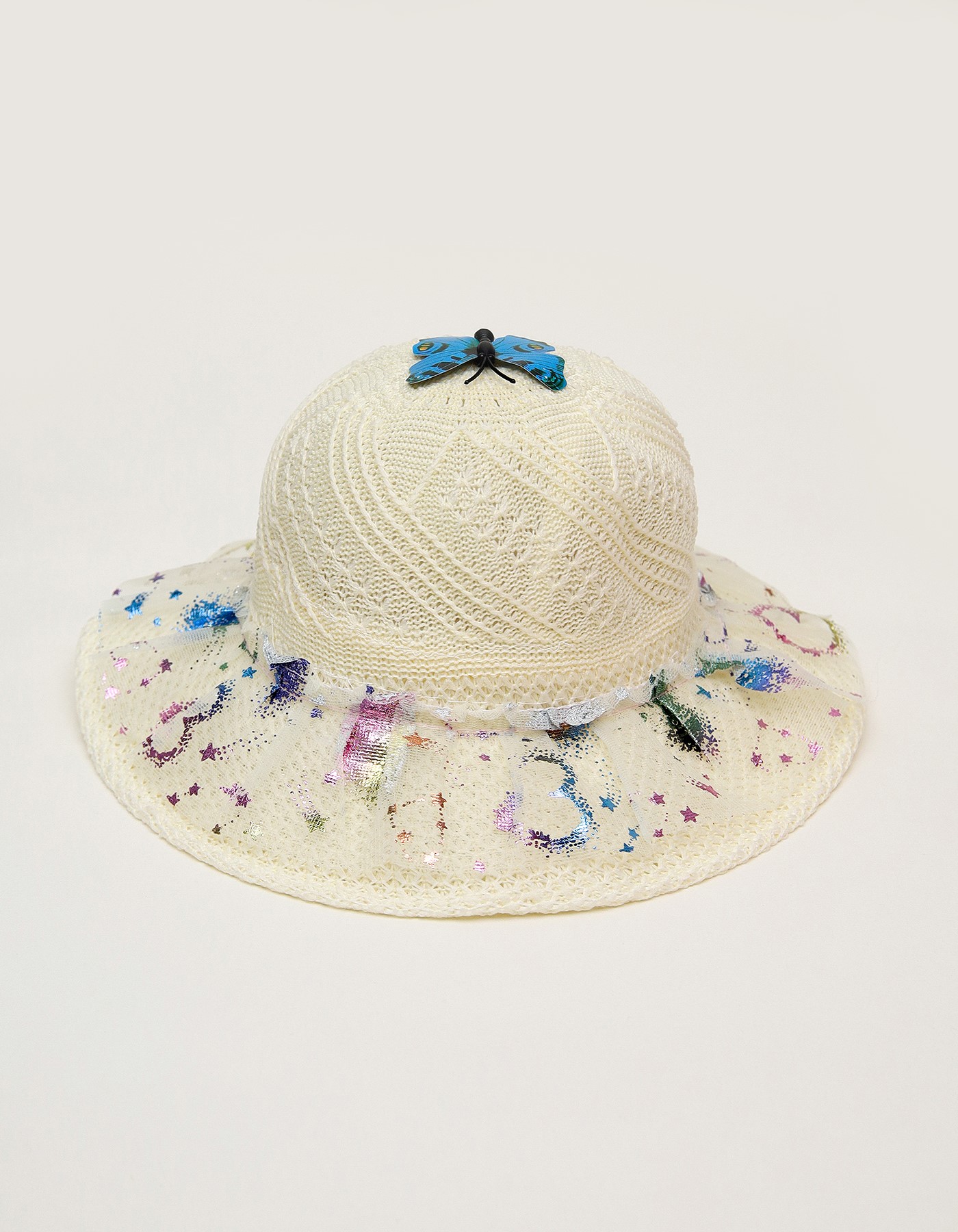 Add a touch of magic to your little ones outfit with this adorable summer hat. Featuring a delicate lace design, shimmering star accents, and a cute 3D butterfly on top, this hat is perfect for sunny outings, birthdays, or playdates.