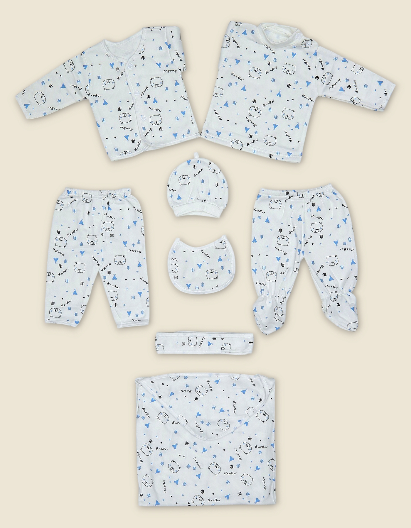 Complete starter set for newborns with coordinated cartoon animal print. Includes essential clothing and accessories for comfort and gifting.
