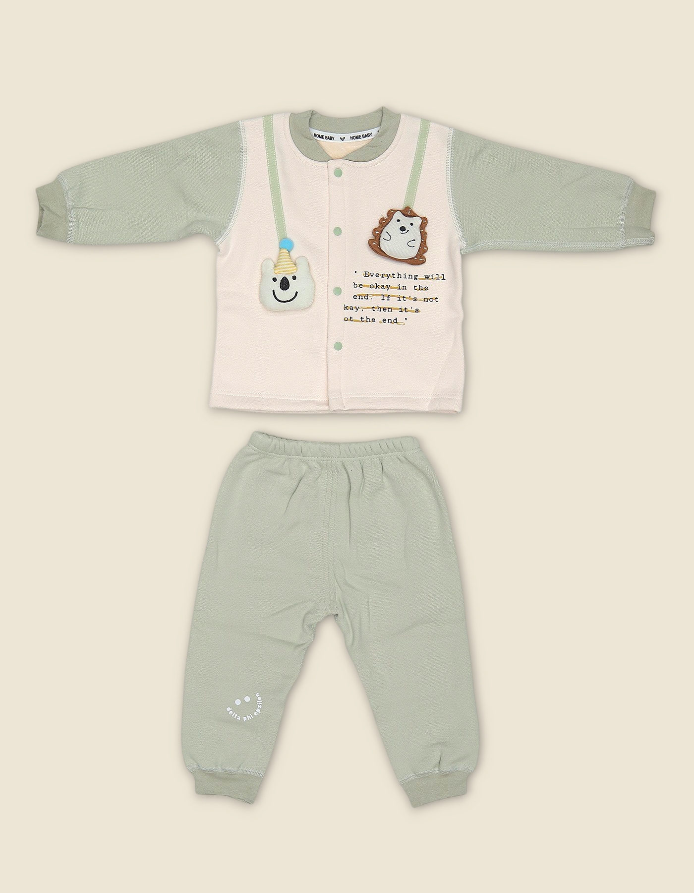 Soft and playful two piece baby outfit with cartoon graphics and motivational message. Includes snap button shirt and matching pants.