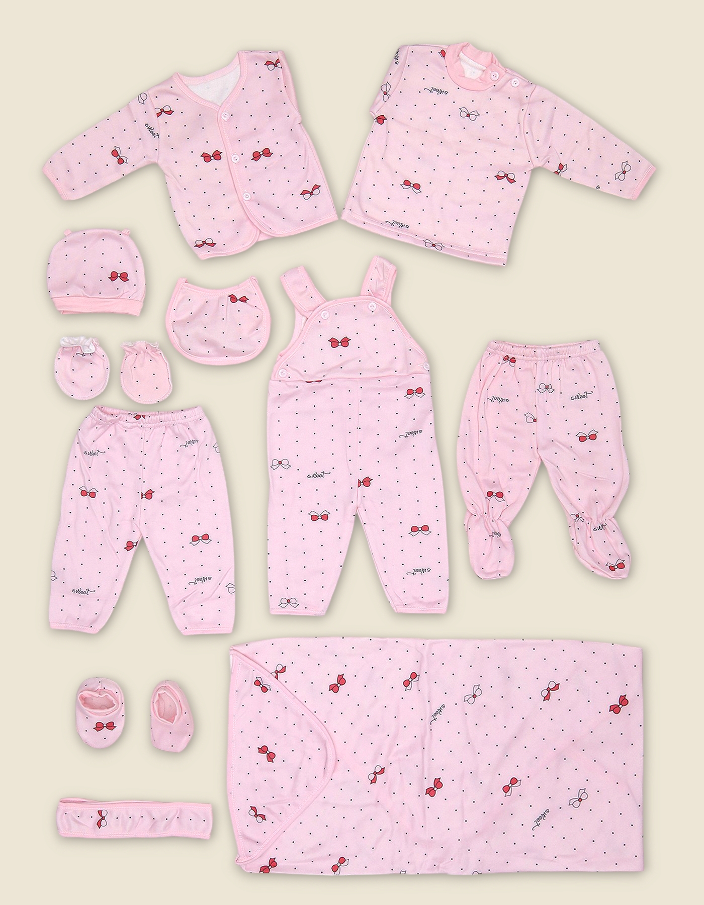 Extended starter set for newborns with cherry and bow print. Includes full clothing and accessories for comfort, warmth and gifting.