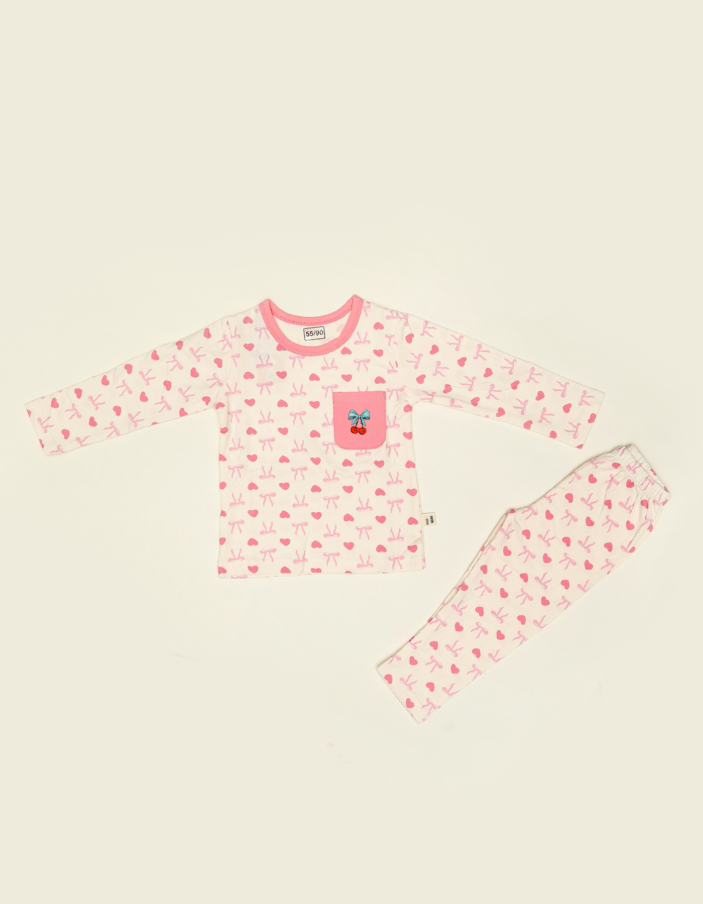 Adorable and stylish, this girls tracksuit features an all-over pink bow and heart print with a cute cherry pocket detail. Soft and breathable, it is designed for everyday comfort and playful charm.