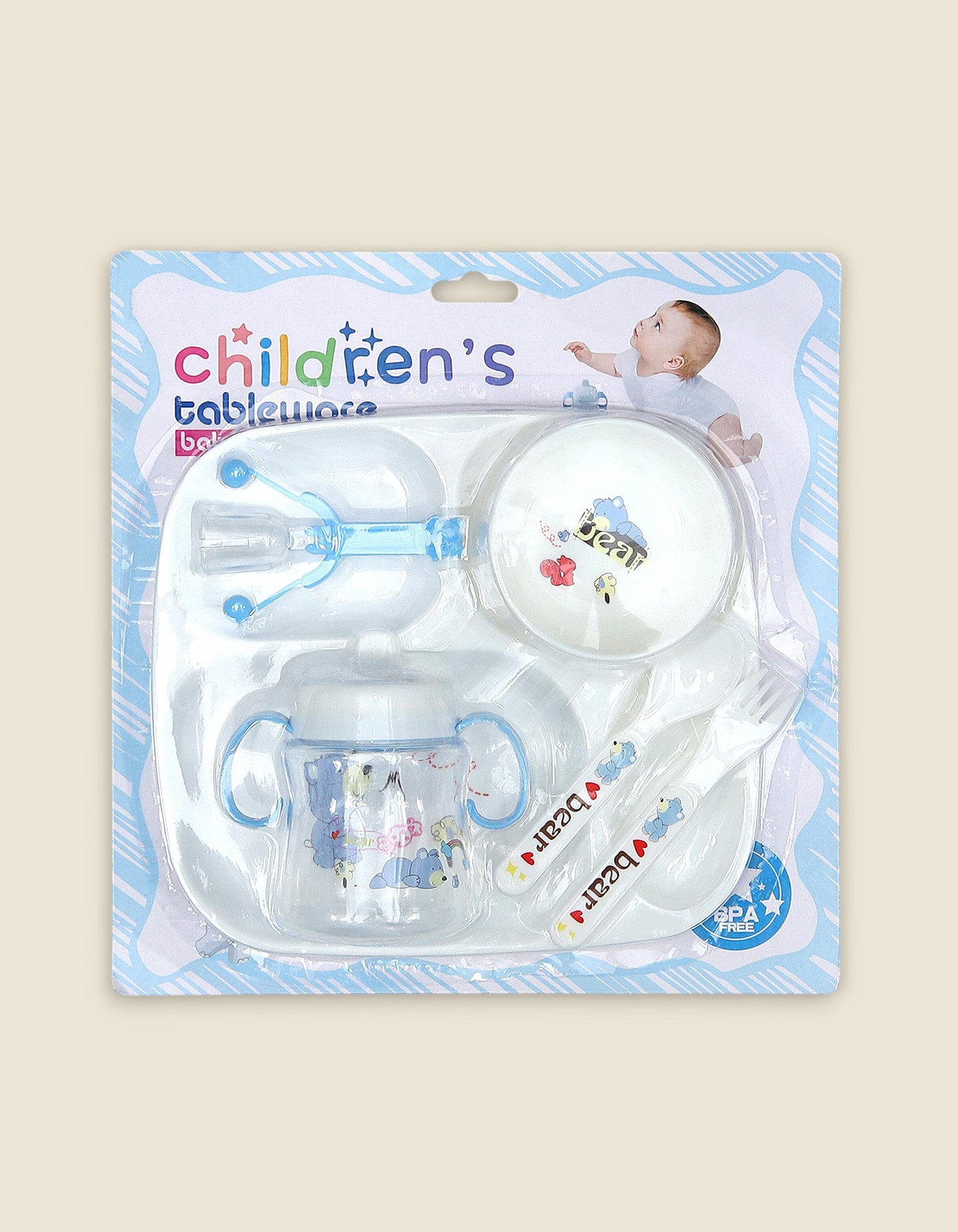 Complete 5-piece baby feeding set with printed training cup, bowl, fork & spoon, and grip feeder. Lightweight, BPA-free plastic with cute pastel designs ideal for weaning and first meals.