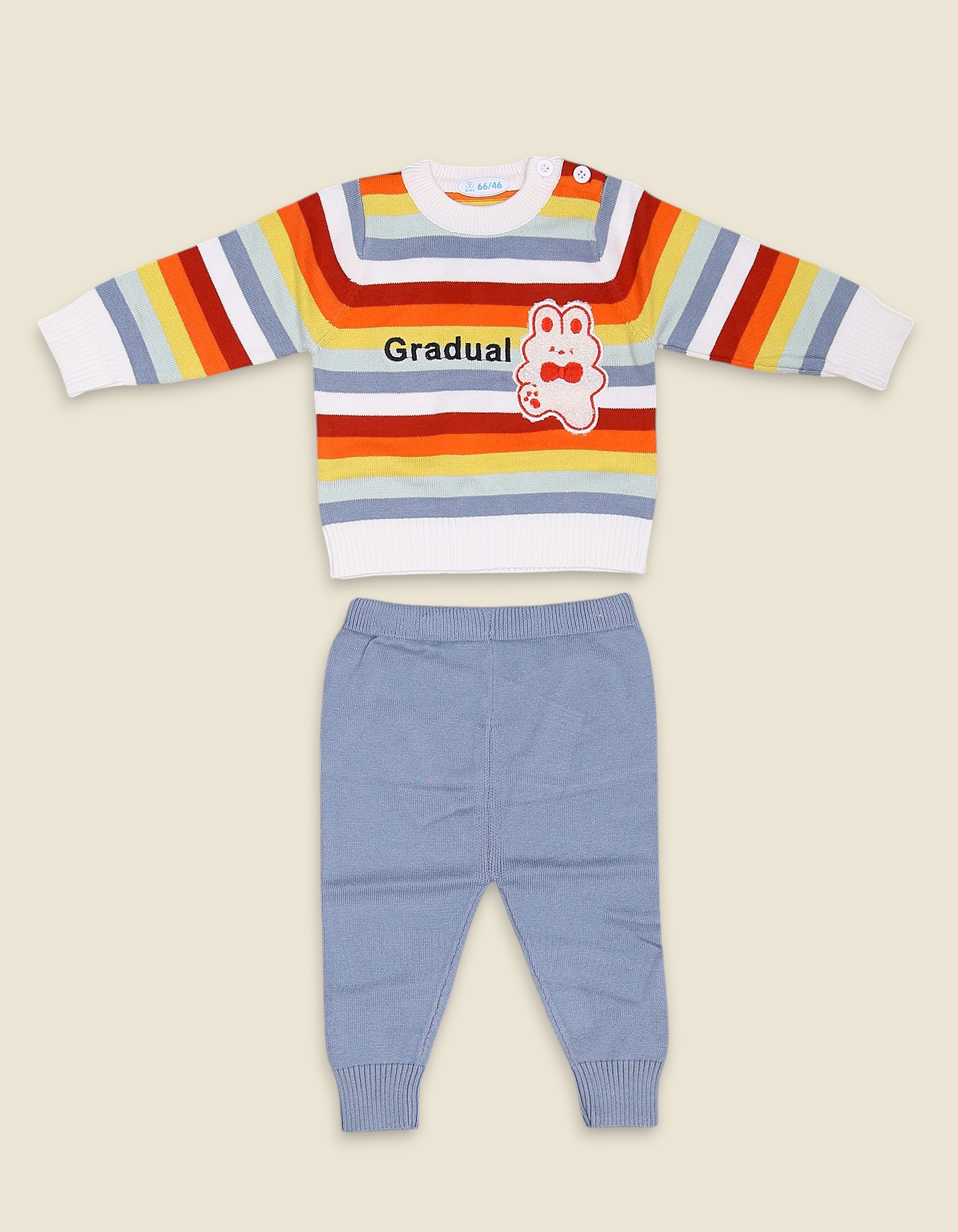 Brighten up winter days with this cheerful woolen knit suit for boys. The striped sweater features bold multi-color or parrot-green stripes with an adorable bunny patch and Gradual text detail. It comes with matching knit pants in solid colors blue or green, making this set cozy, playful, and perfect for winter wear.