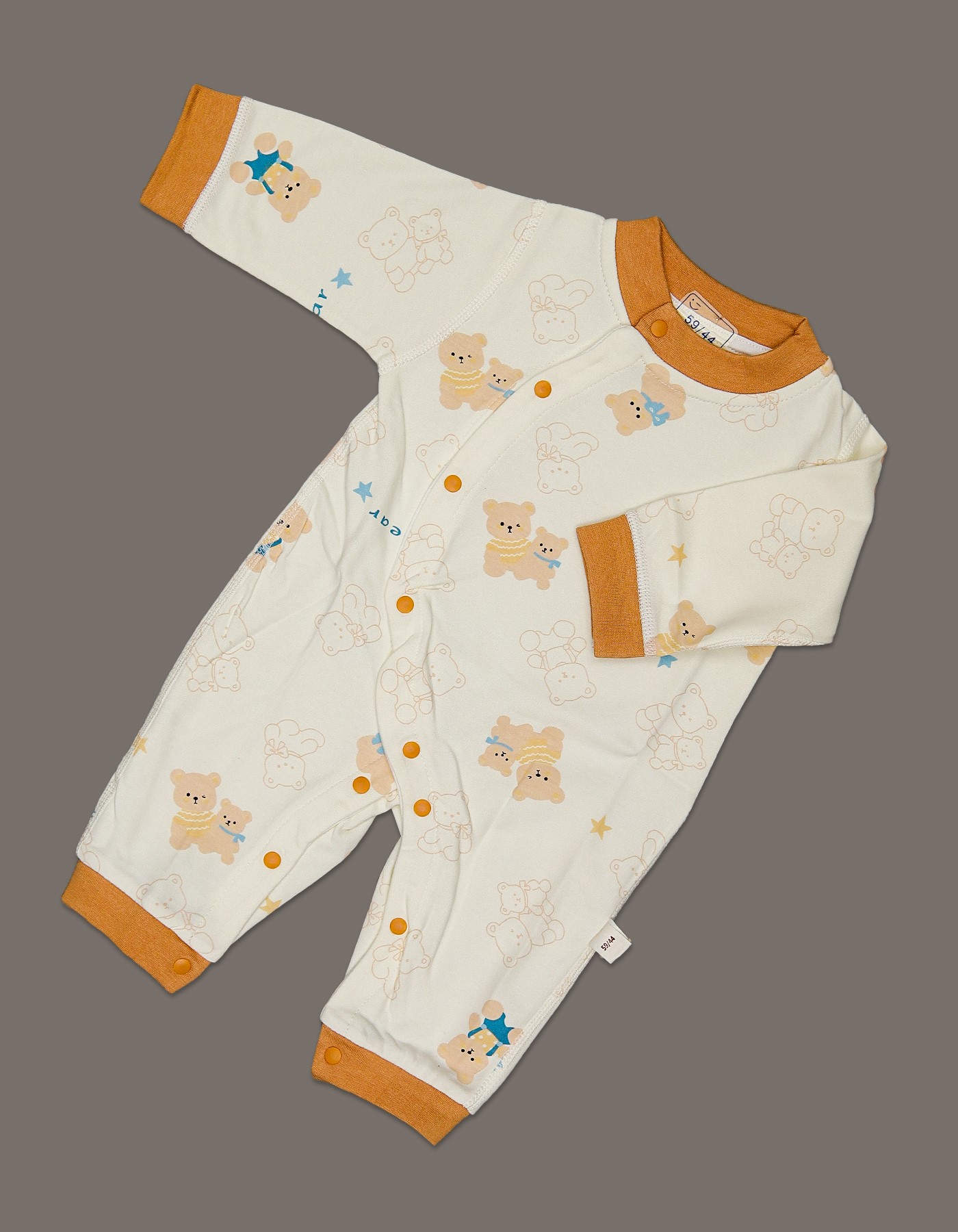 Wrap your little one in cozy comfort with the Cuddle Bear Baby Romper. Designed with soft cotton fabric, this romper features adorable teddy bear prints and contrasting brown trims, making it perfect for everyday wear or special moments. Its front snap-button closure ensures quick and easy dressing, while the breathable material keeps your baby comfortable all day long.