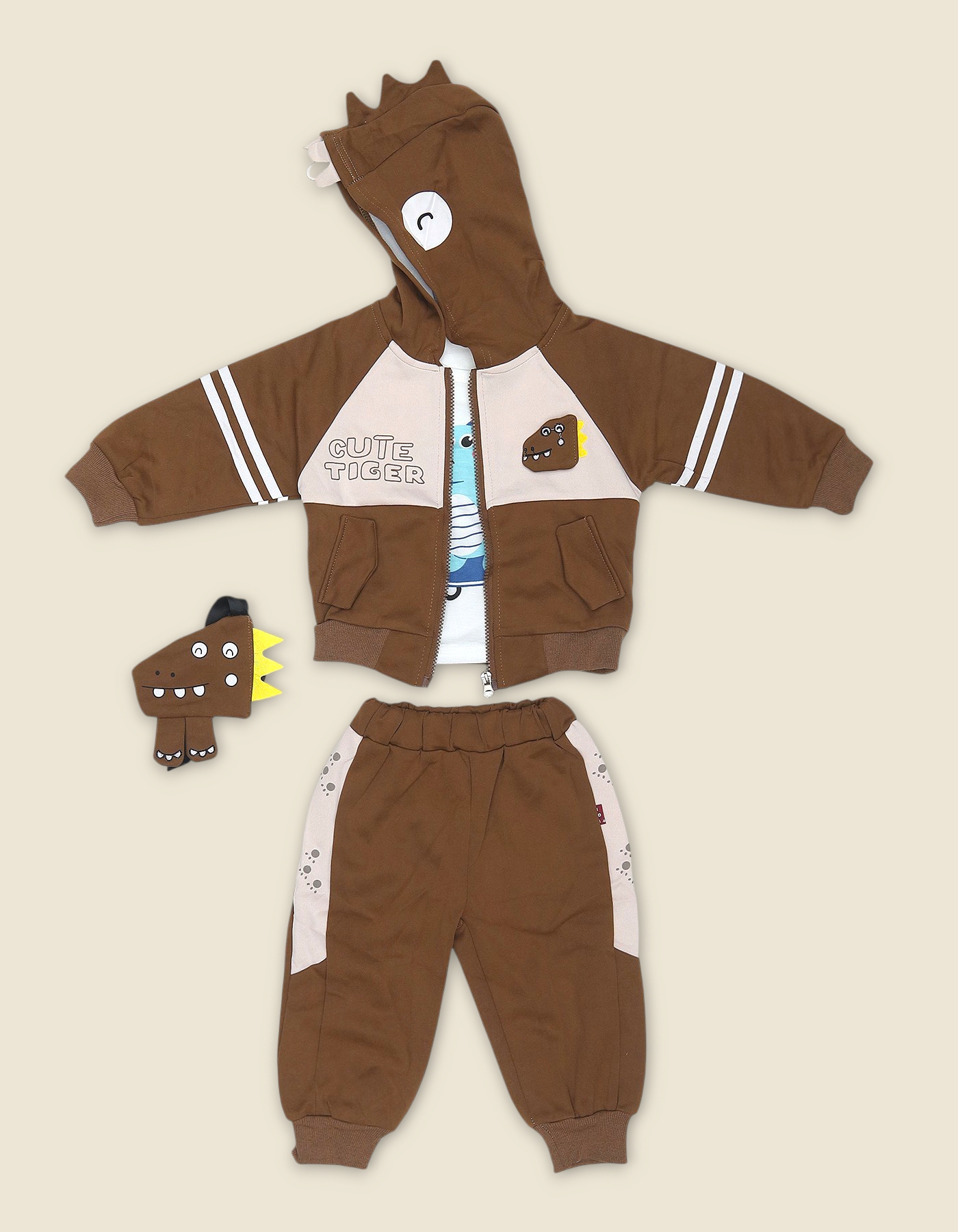 Playful boys outfit with hooded jacket, printed t shirt and matching pants. Features cartoon tiger graphics and fun character details for a stylish casual look.
