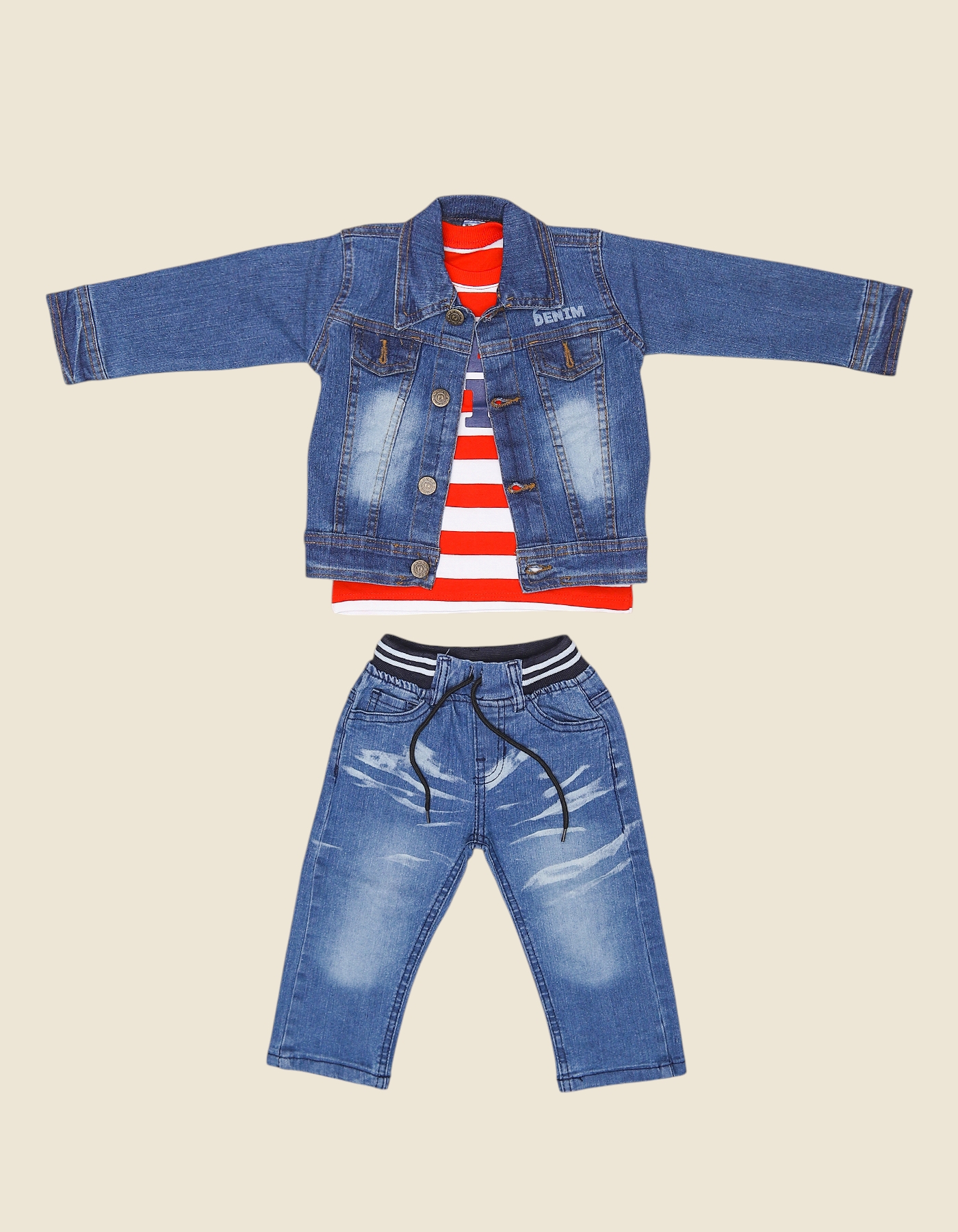Three piece kids outfit with a denim jacket a red and white striped tee and elastic waist jogger jeans with a contrast ribbed waistband. Casual durable and easy to wear for everyday play.