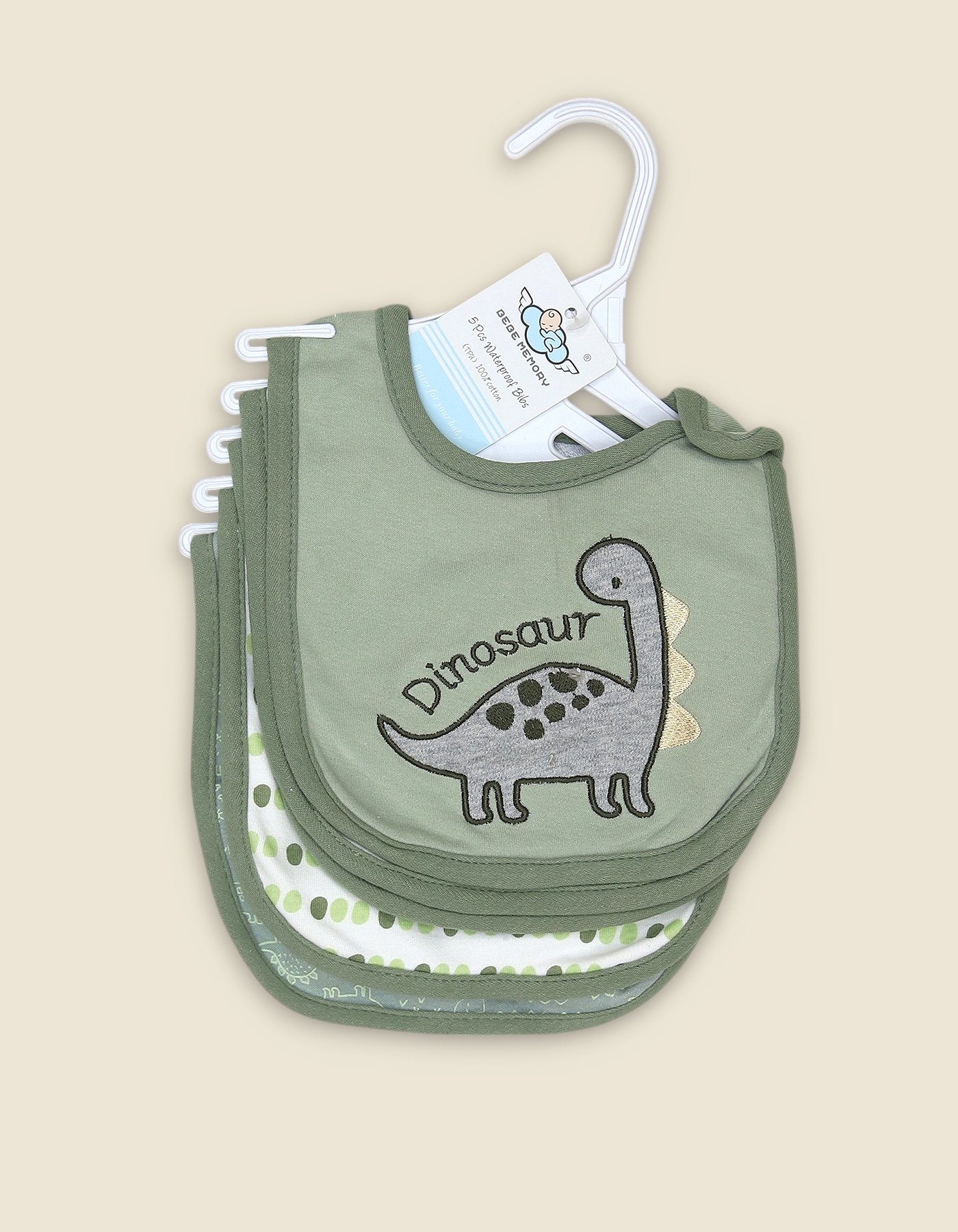 Soft and absorbent baby bibs with playful dinosaur embroidery and green patterns. Perfect for daily feeding and gifting.