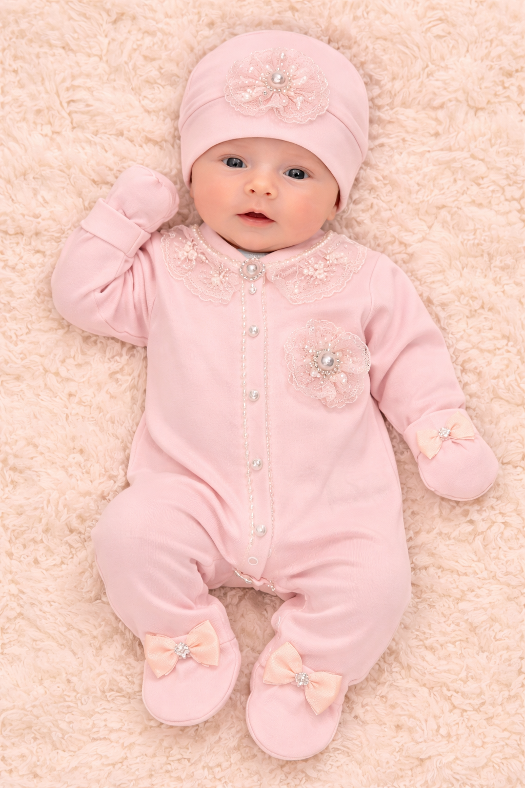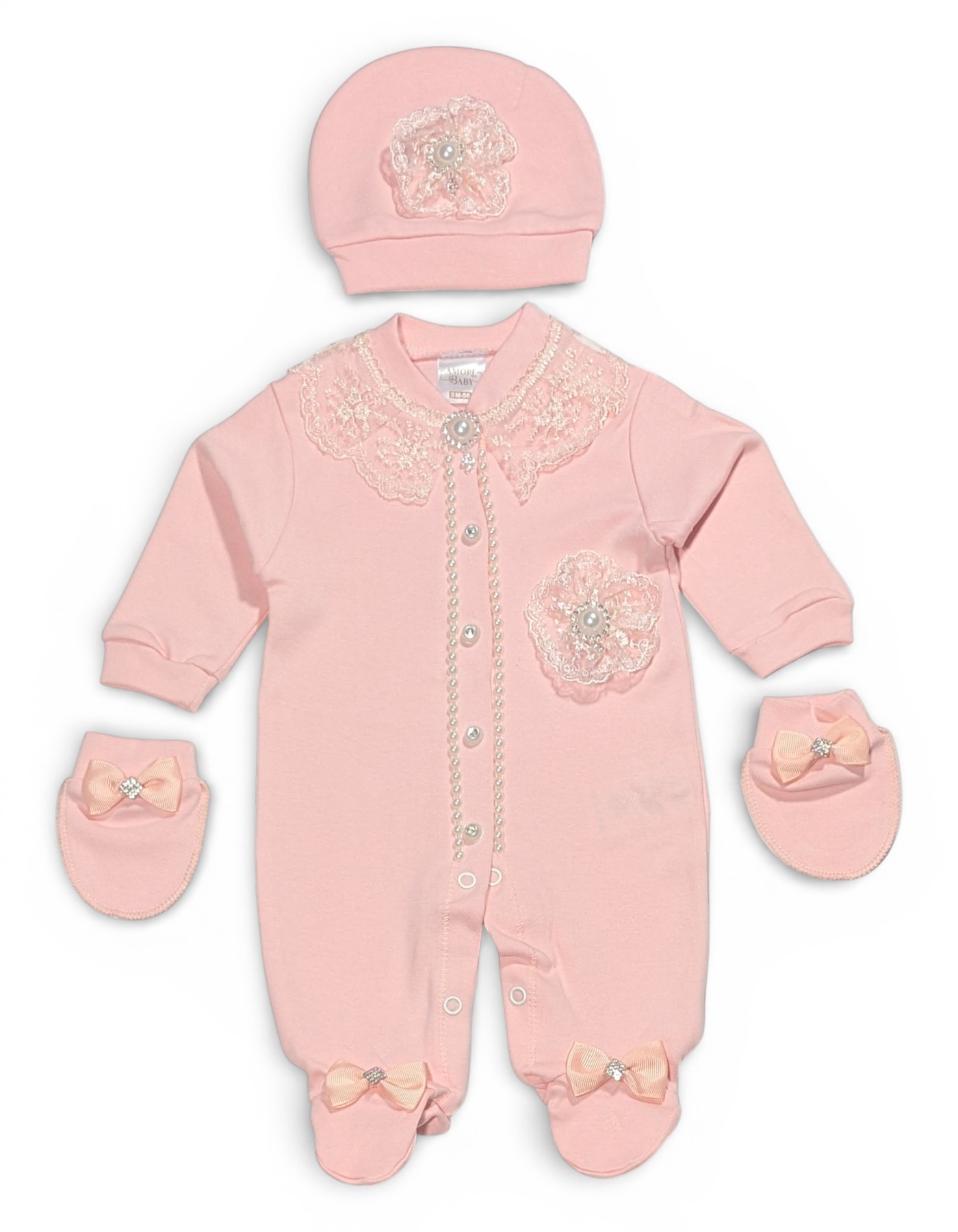Product Description: Wrap your little princess in elegance with this beautifully designed peach baby romper set. Crafted from soft, breathable, and baby-friendly fabric, this charming outfit ensures all-day comfort while keeping your baby stylish and cozy. The romper features delicate lace detailing on the collar, pearl-inspired button accents, and a lovely floral applique for a graceful, premium look. Snap button closures along the front and bottom make dressing and diaper changes quick and convenient. The set is perfectly completed with matching mittens and a coordinating cap, each adorned with sweet bow details for an extra touch of cuteness.