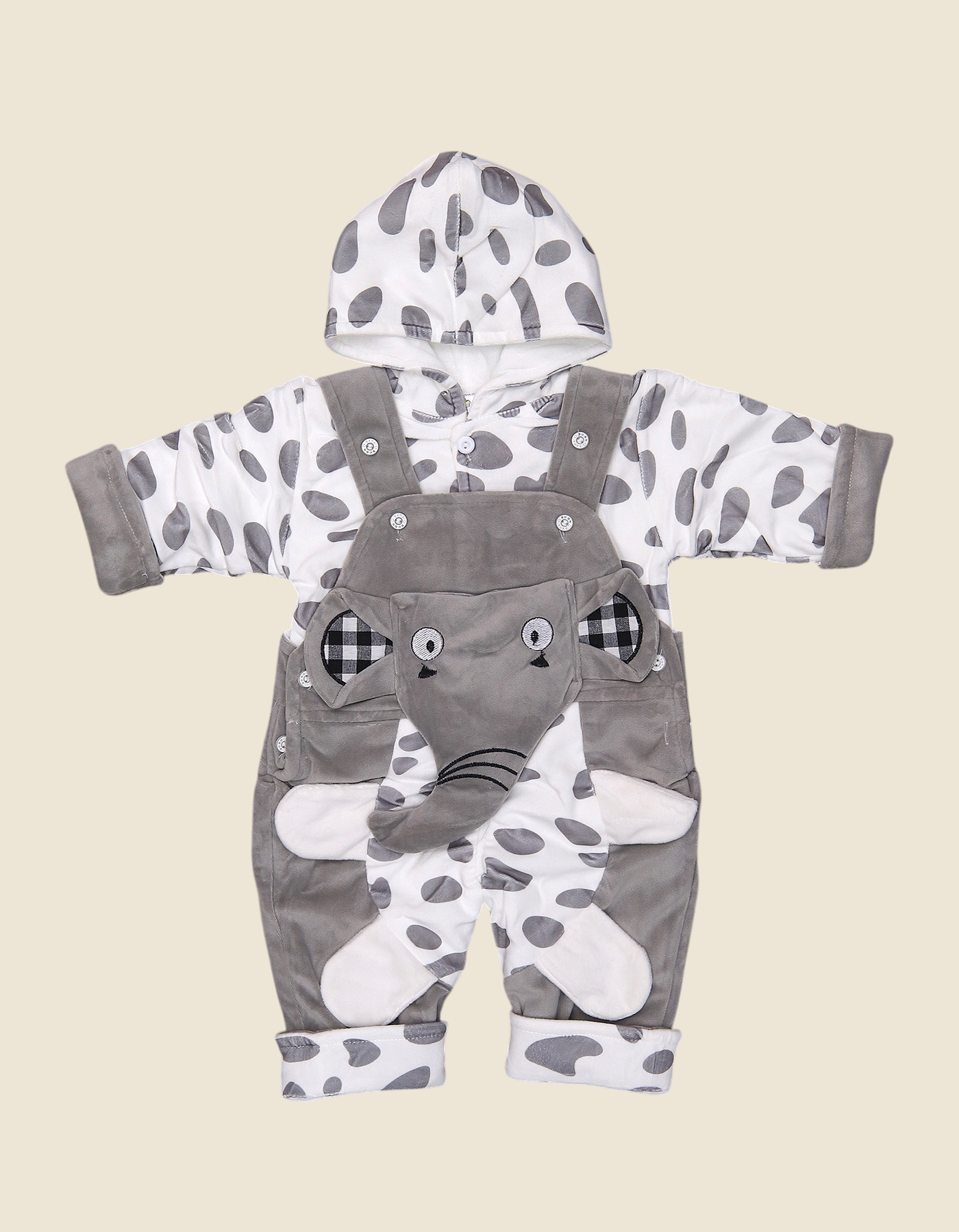 The Newborn Elephant Overalls Quilt Romper is a playful and cozy one-piece outfit perfect for keeping babies warm and stylish. Designed with a 3D elephant face and trunk applique on the overalls, paired with a polka dot hoodie and sleeves, this romper gives a fun animal-themed look that little ones will adore. Made from soft quilted fabric, it provides warmth and comfort during colder days. The romper features a button closure for easy dressing, foldable sleeve cuffs, and a hoodie for extra coverage. Its grey and white polka dot design makes it gender-neutral and trendy.