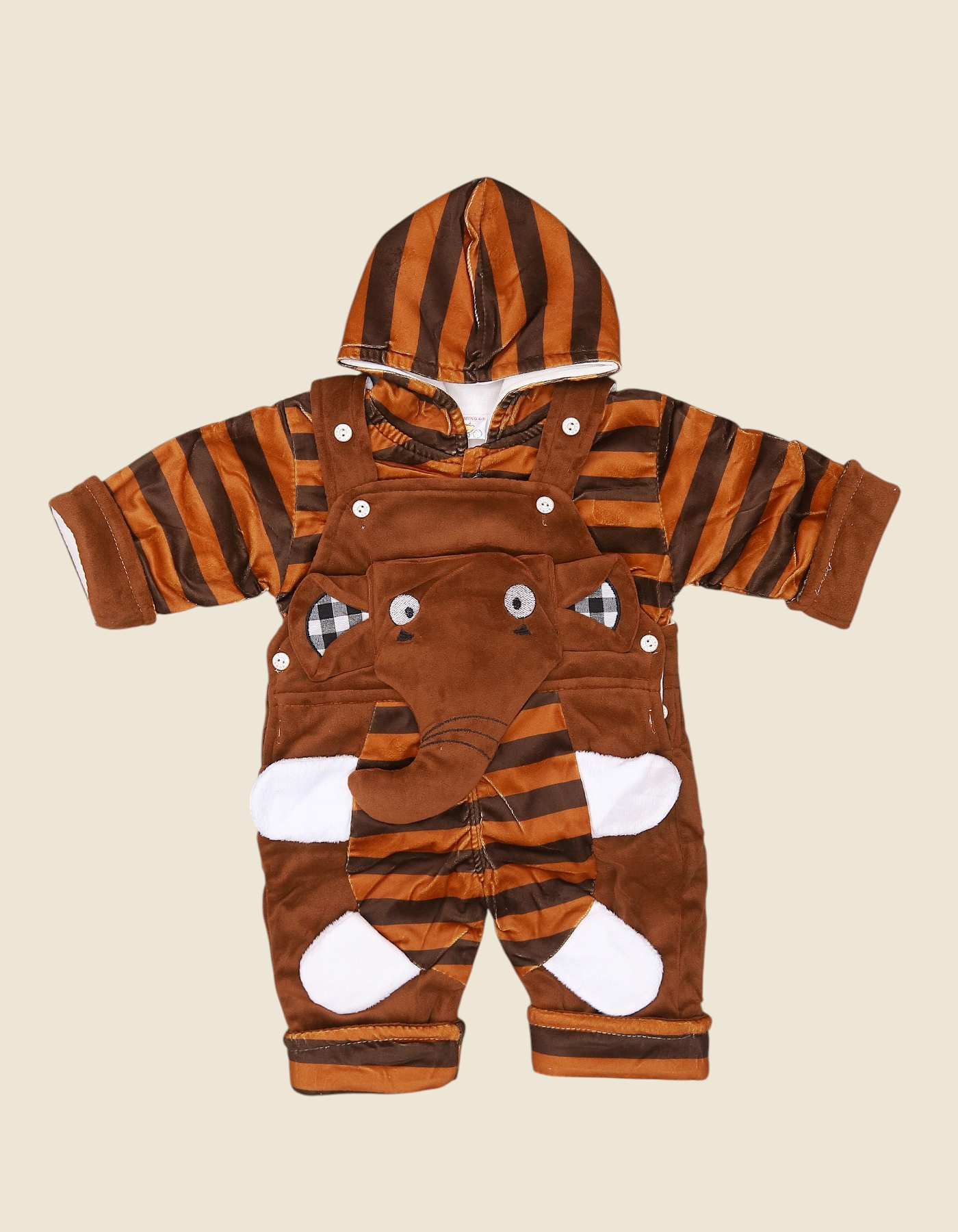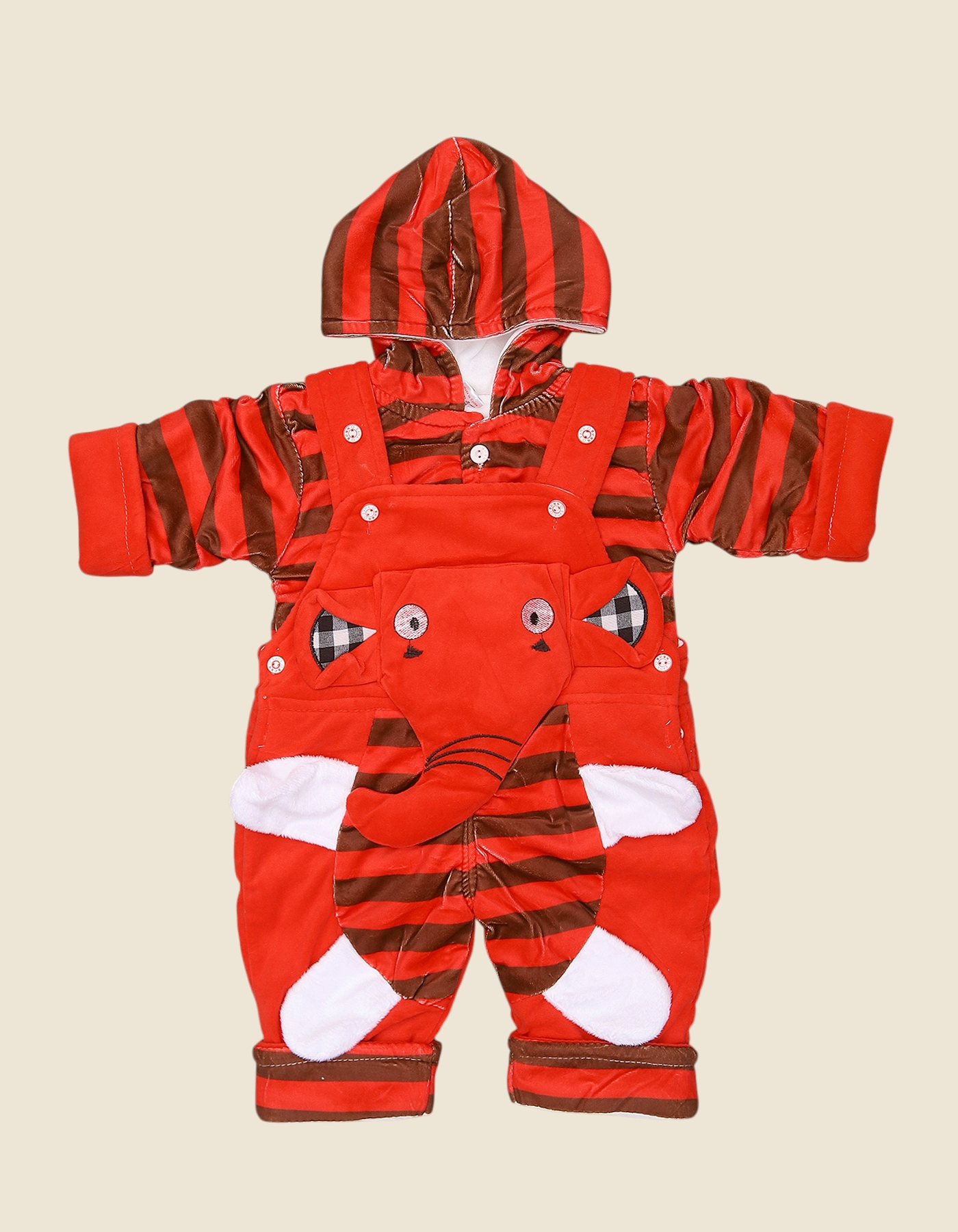 The Newborn Elephant Overalls Quilt Romper is a warm and playful outfit designed to keep babies cozy during winter. Featuring a 3D elephant face with trunk and ear applique this romper has a fun animal theme that makes it extra adorable. The striped hoodie and sleeves add a trendy touch, while the soft quilted material provides comfort and warmth. Available in Brown and Red variants, this romper is designed with snap button closures for easy diaper changes and foldable cuffs for adjustable comfort. It’s perfect for both indoor and outdoor winter wear.