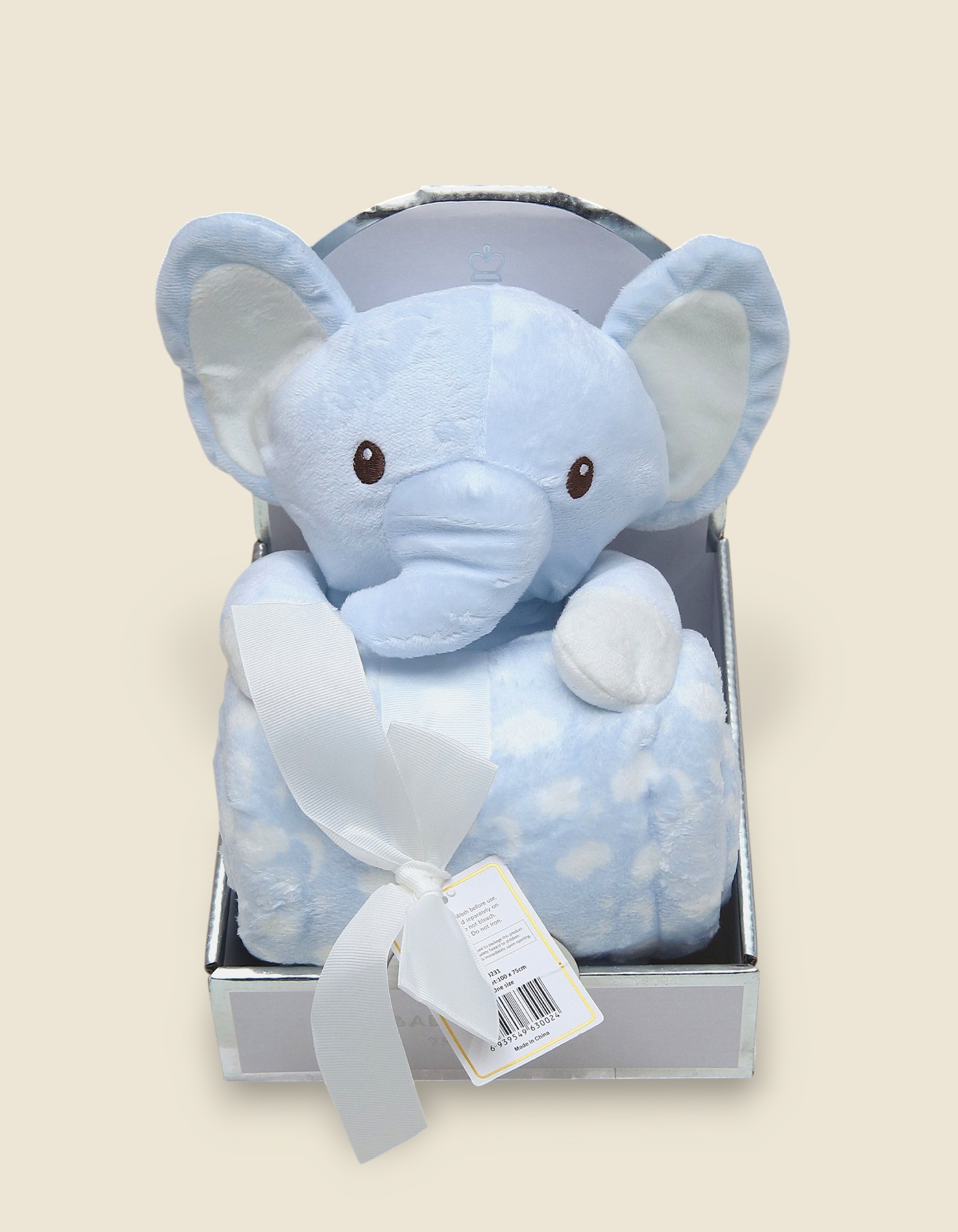 Soft baby gift set featuring plush elephant toy and cozy fleece blanket. Perfect for newborns, baby showers and special occasions.