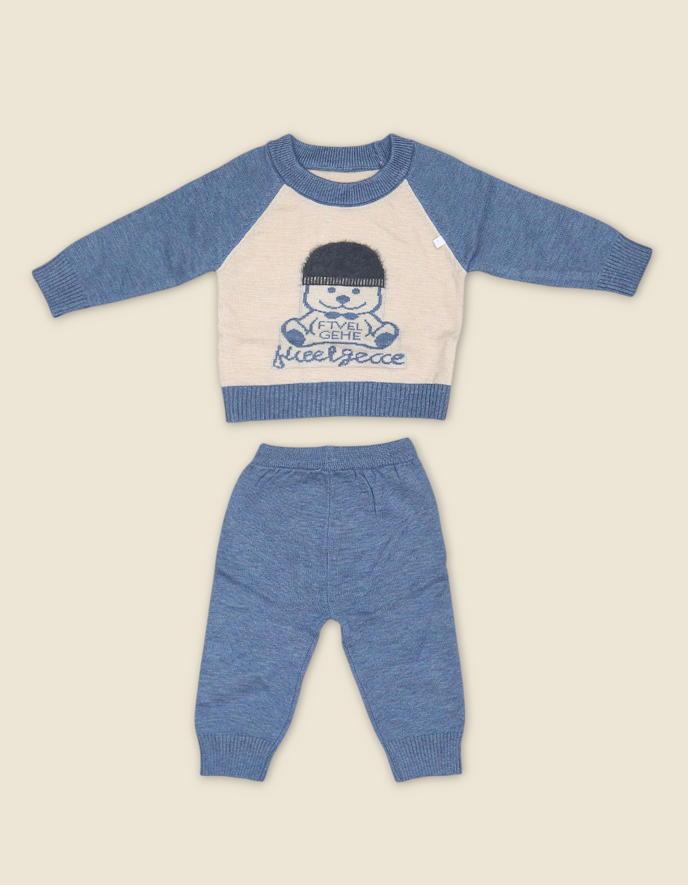 Winter-ready woolen outfit for boys with cartoon graphic sweater and matching pants. Designed for warmth, comfort and playful seasonal style.