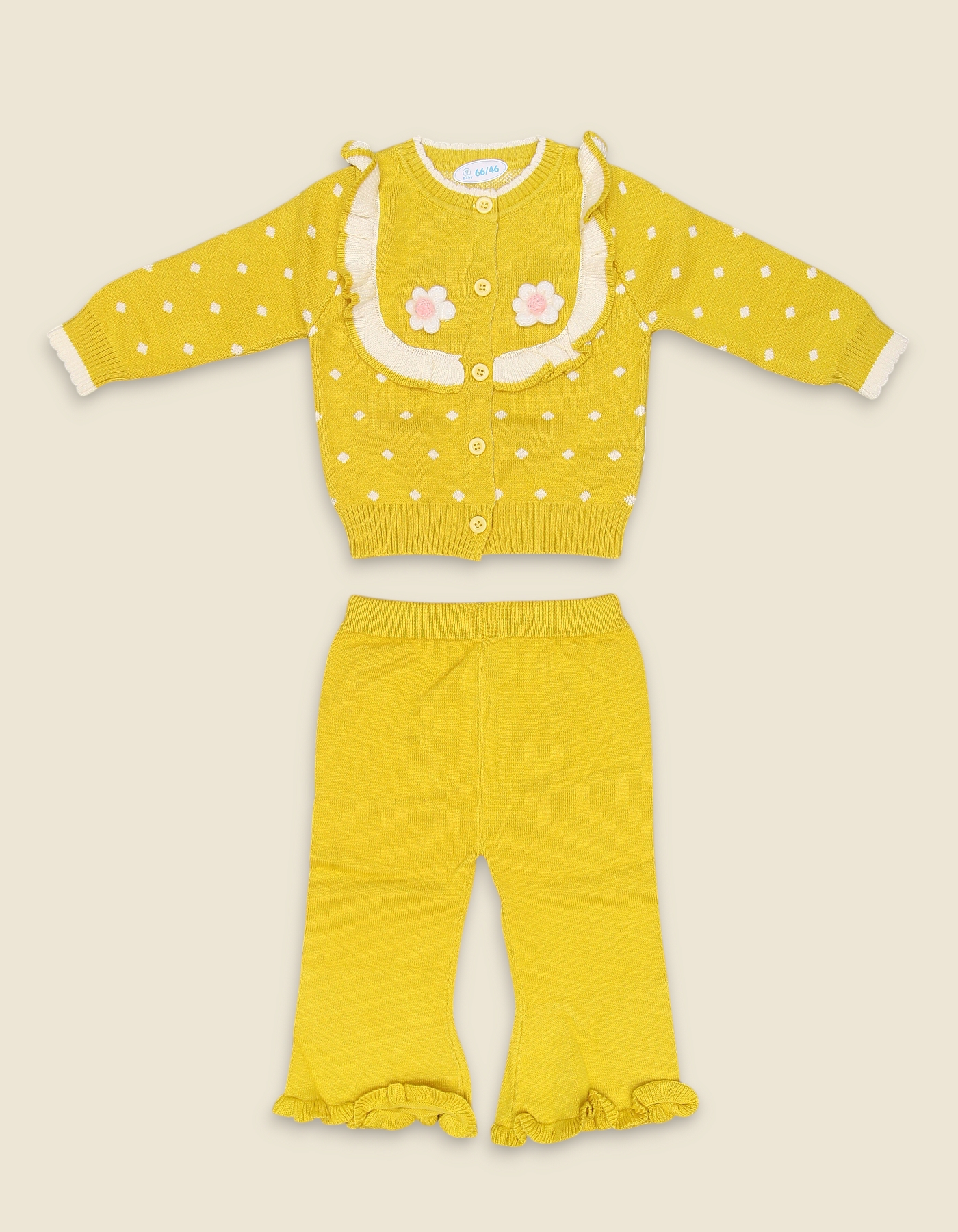 The Floral Polka Mustard Woolen Suit is a bright and stylish winter outfit made to keep your little one cozy and adorable. This 2-piece set includes a buttoned cardigan with ruffle-trimmed collar, floral applique, and white polka dot pattern, paired with matching mustard pants featuring ruffled hems for a girly finish. Crafted from a soft wool blend, the set ensures warmth, breathability, and comfort for daily wear. The cardigans detailed embroidery and playful design add charm, while the pants are designed with a stretchable waistband and flared ruffle ends, offering both comfort and fashion. Perfect for winter outings, parties, and casual gatherings, this woolen suit is a must-have for stylish little girls.