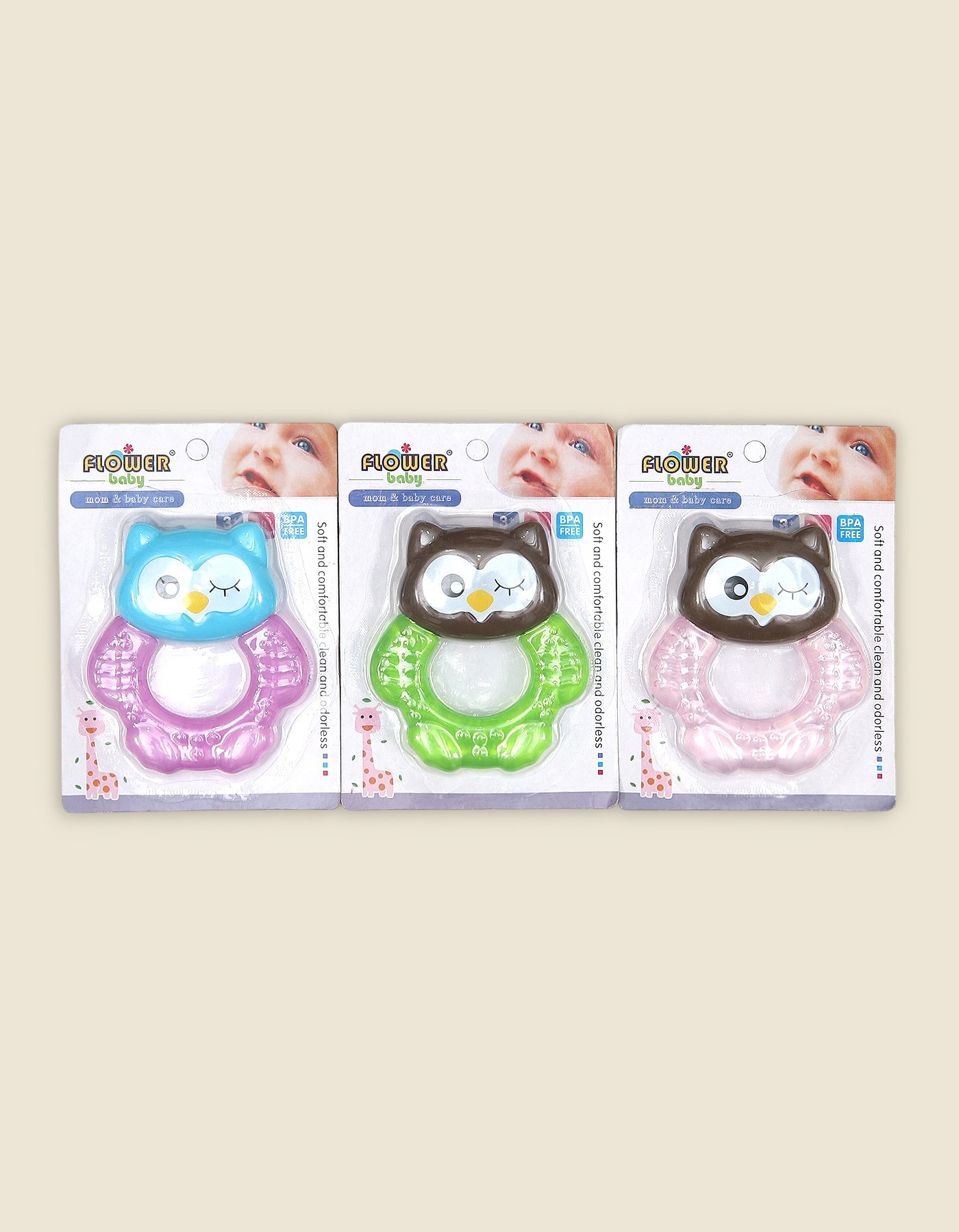 Three soft baby teethers shaped like owls in assorted colors. Made from safe BPA free plastic and silicone. Easy for small hands to hold and designed to soothe sore gums during teething. Individually retail packed and ready for sale.