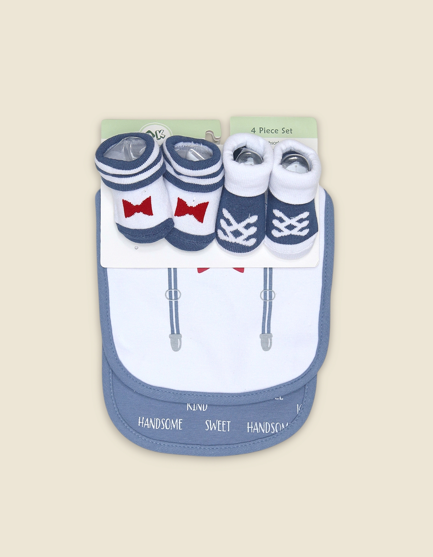 Coordinated baby set with bib and socks in formal outfit design. Perfect for newborn boys, feeding and gifting