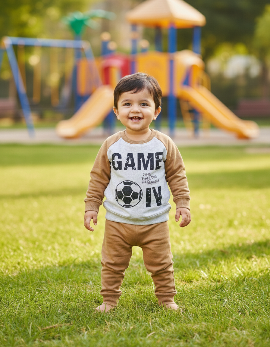 Playful and energetic, this boys tracksuit is designed for young sports fans. Featuring a bold Game On slogan with a football graphic, it is perfect for active kids who love comfort and style.