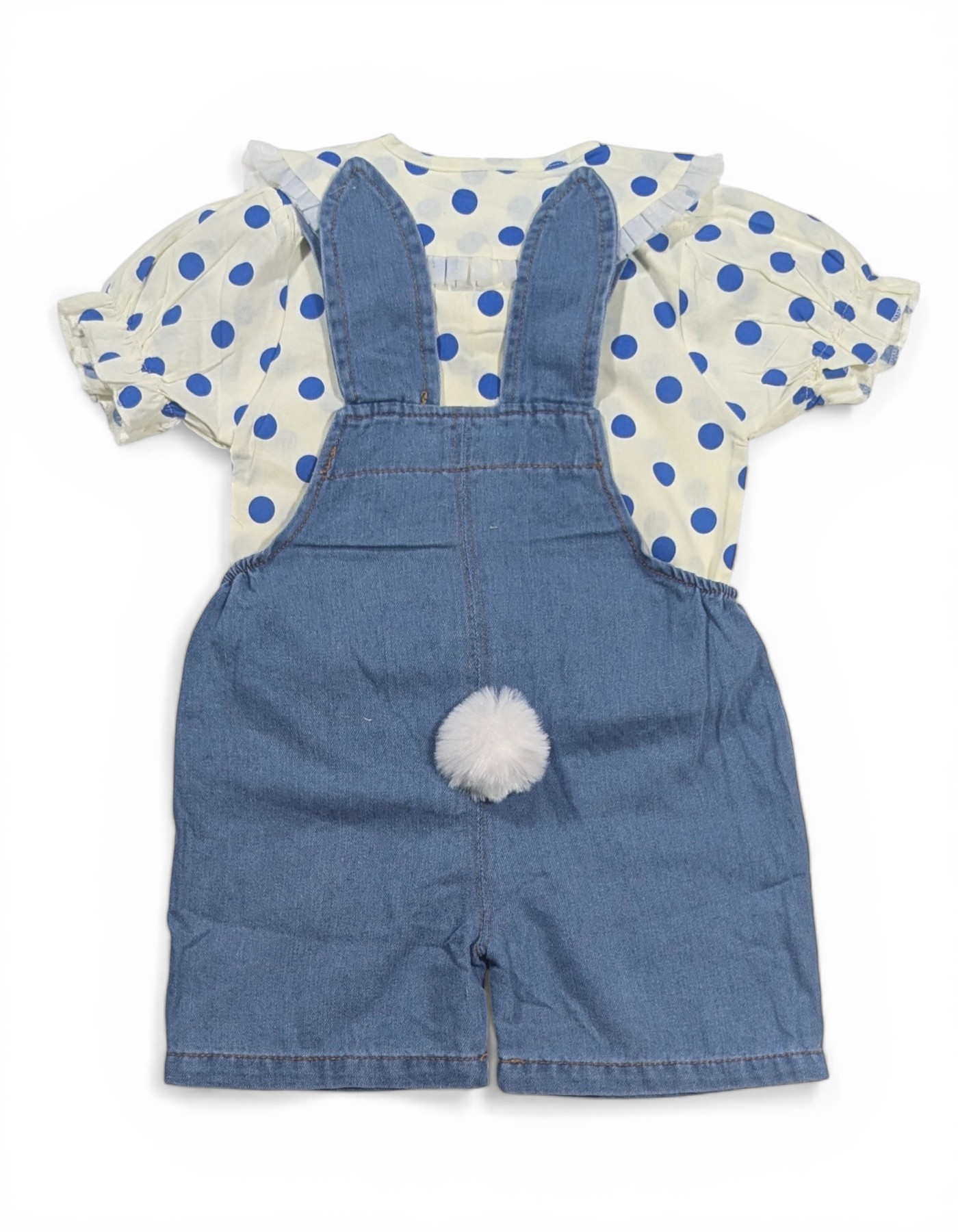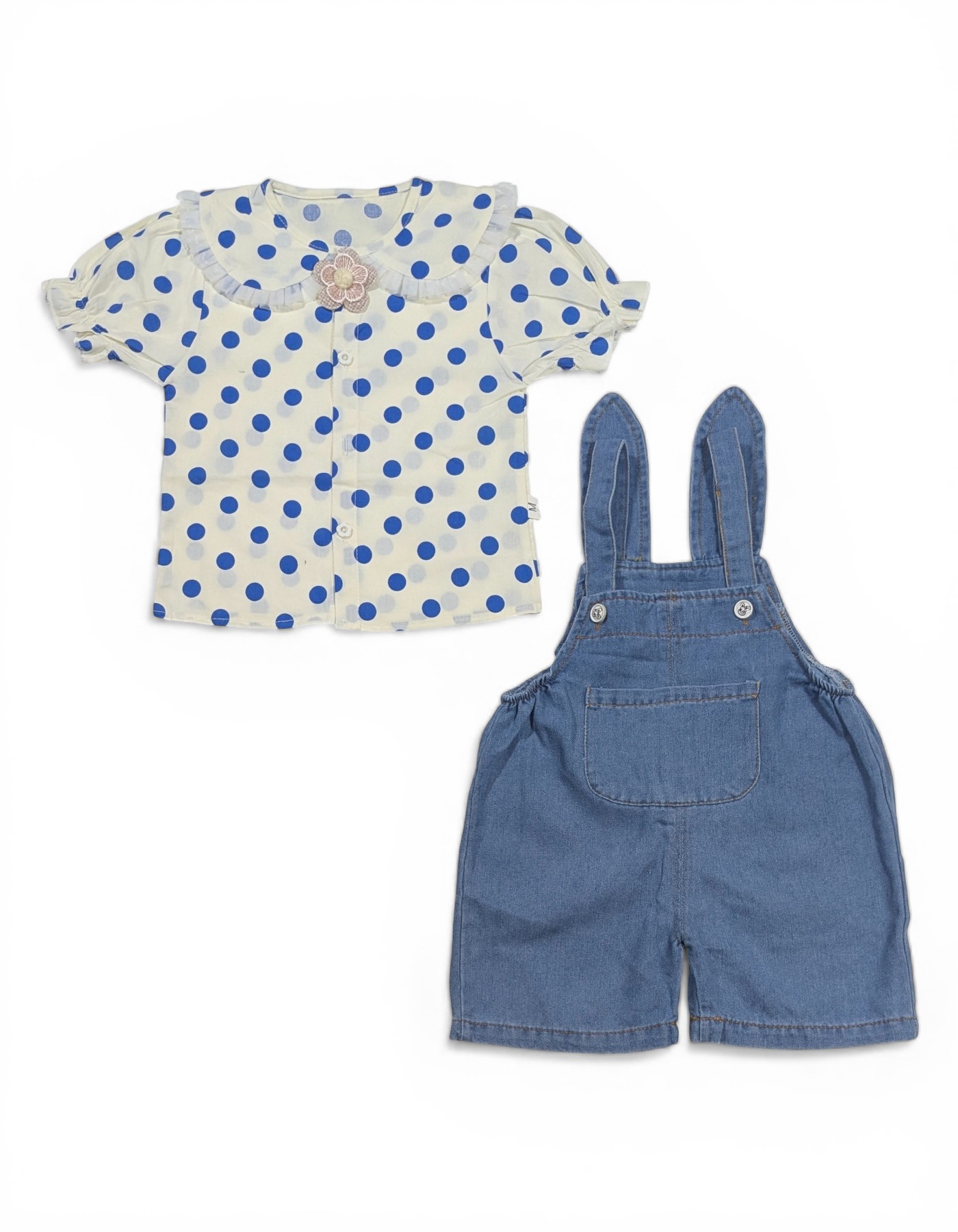 Vintage Polka Dot & Bunny Ear Denim Set Elevate her everyday style with this darling two-piece outfit! This set pairs a sophisticated button-down blouse with durable denim overalls, creating a look that is both photo-ready and play-approved.