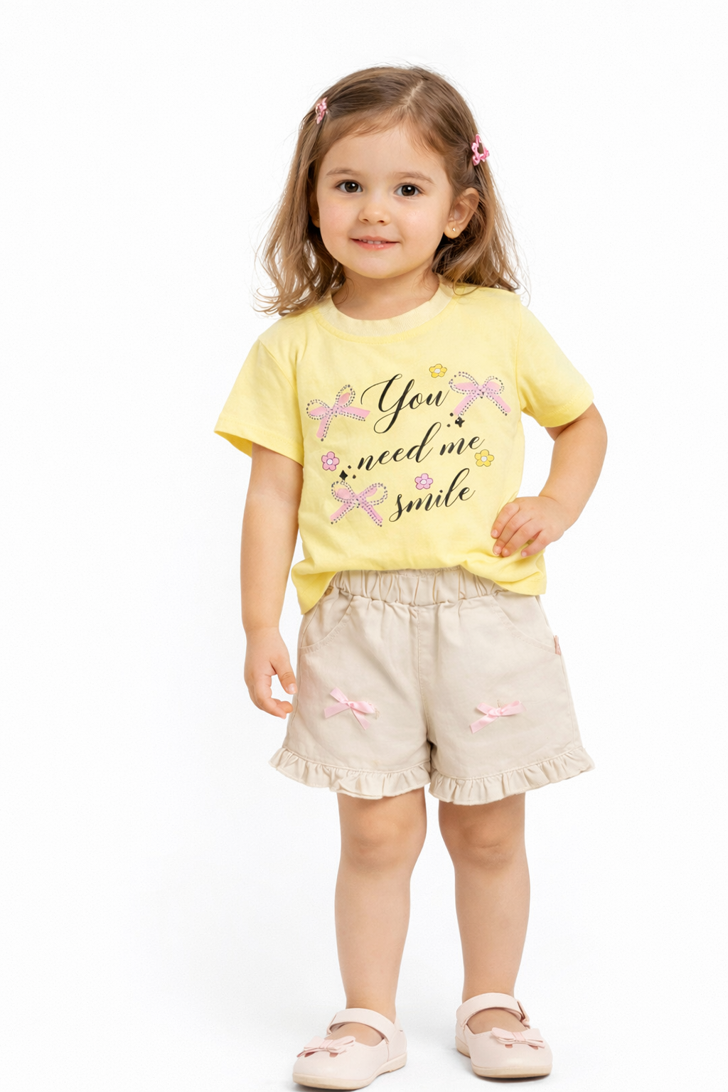 Sweet Sunshine 2-Piece Ruffle & Bow Set Brighten up her wardrobe with this adorable two-piece summer suit! Designed for both style and play, this set combines a soft lemon-yellow graphic tee with charming cream ruffled shorts for a look that’s as sweet as a sunny day.