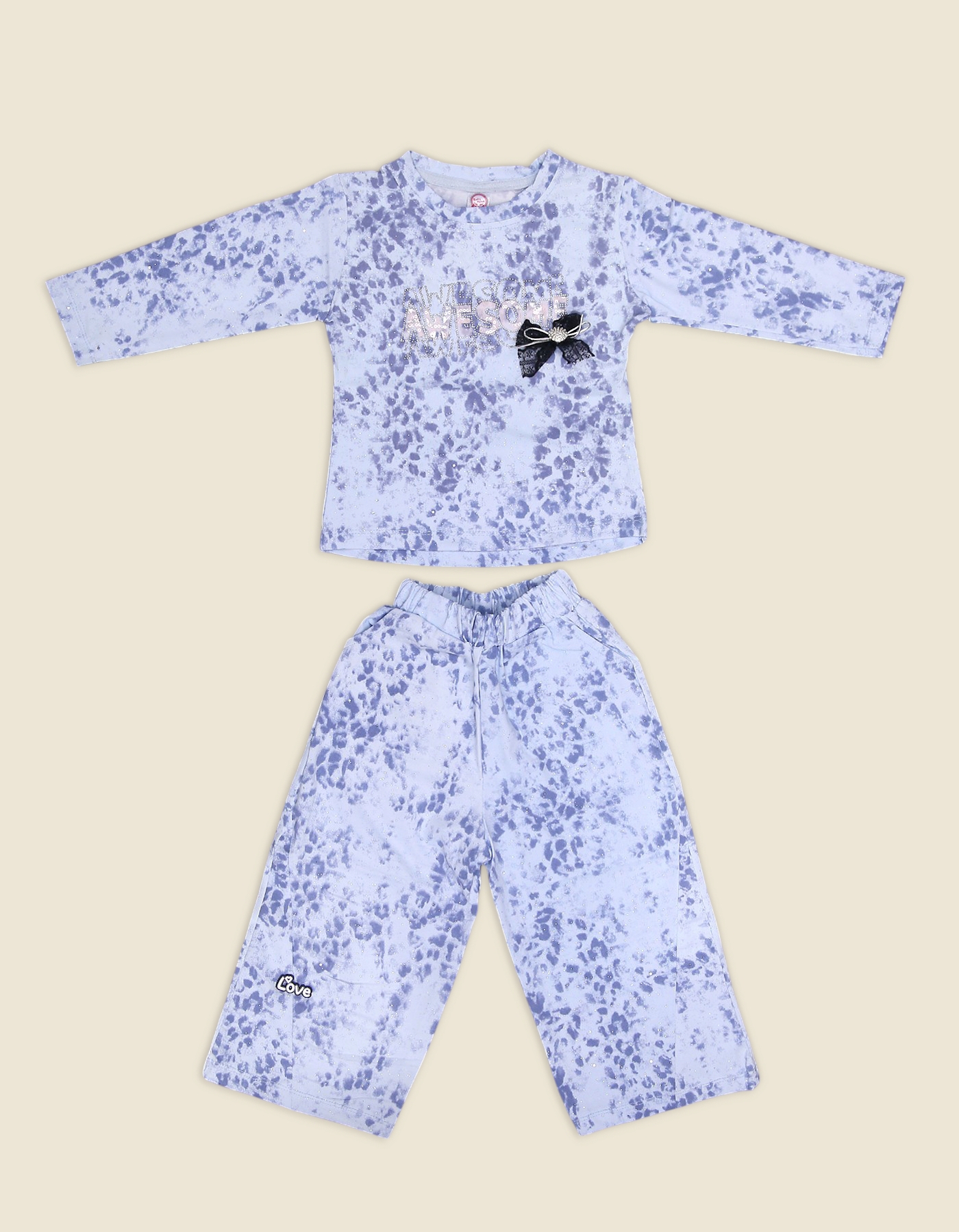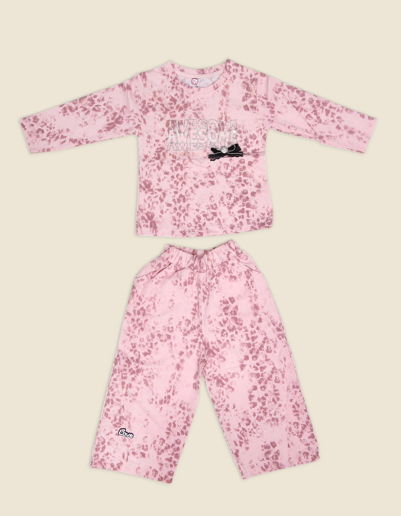 The Girls Awesome Bow Suit is a stylish and comfy 2-piece outfit designed with a modern all-over print. The long-sleeve top features the bold word AWESOME embellished with sparkly accents and a decorative bow with charm detail, paired with matching wide-leg pants that have a cute Love patch for extra charm. Available in Baby Pink and Blue, this set is perfect for casual wear, playdates, or daily outings, giving little girls a trendy and confident look.
