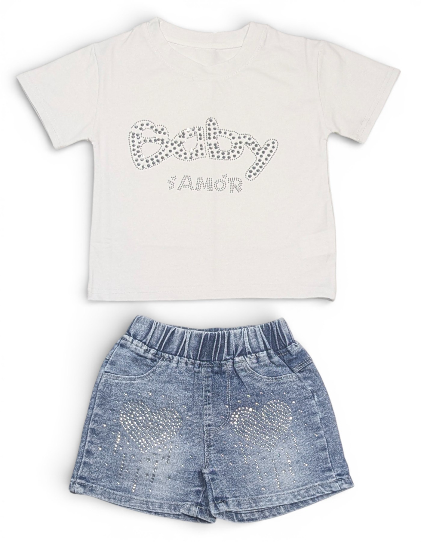Add a touch of sparkle to her wardrobe with this adorable 2-piece girls outfit set. The soft white short-sleeve T-shirt features a shimmering “Baby Amor” rhinestone design that adds charm and shine to her everyday look. Stylish yet comfortable, it’s perfect for casual outings, summer days, and special moments.