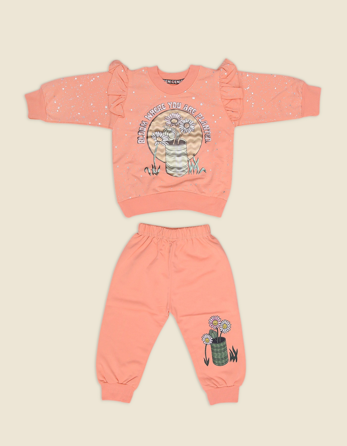 The Girls Bloom Floral Suit is a charming and comfortable outfit that combines style with a sweet message. This 2-piece set features a cozy sweatshirt with ruffle sleeves, glitter accents, and a Bloom Where You Are Planted floral graphic, paired with matching jogger pants decorated with a daisy flower pot print. Available in Peach and Skin shades, its the perfect choice for casual wear, playdates, or outings, keeping your little girl both comfortable and stylish.