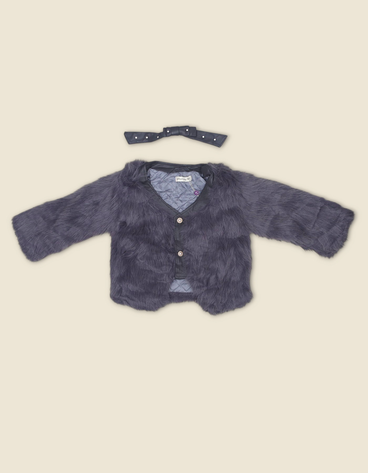 A cozy and stylish winter set featuring a dark gray faux fur jacket with quilted lining and a matching headband. Designed for warmth and elegance, perfect for festive outings and cold weather.
