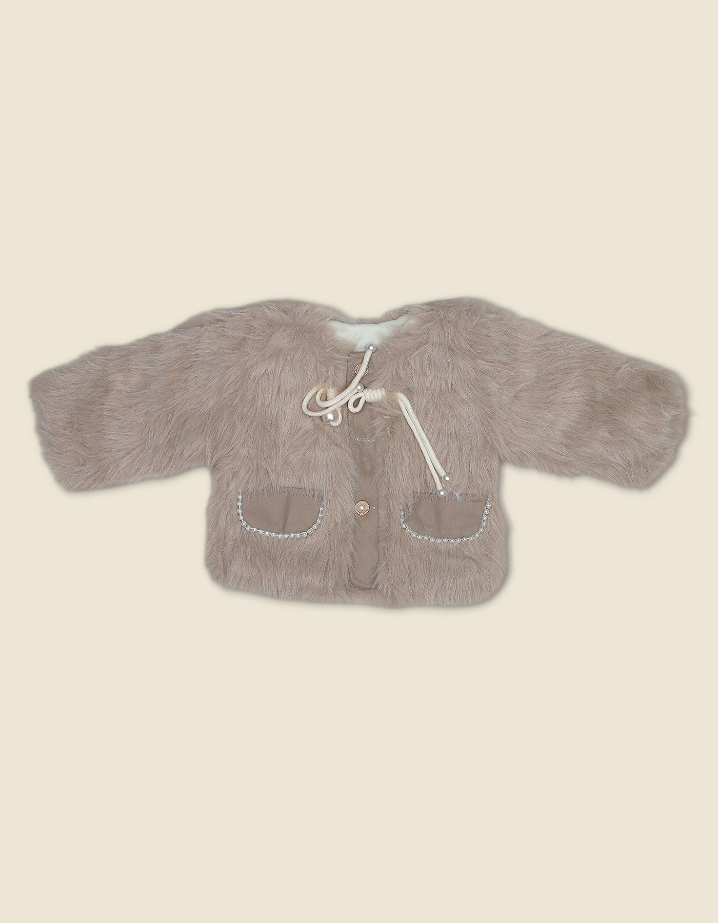 A cozy and stylish faux fur jacket for girls in a soft light brown shade. Features front pockets with decorative stitching, button closure, and a drawstring collar—perfect for warmth and winter fashion.