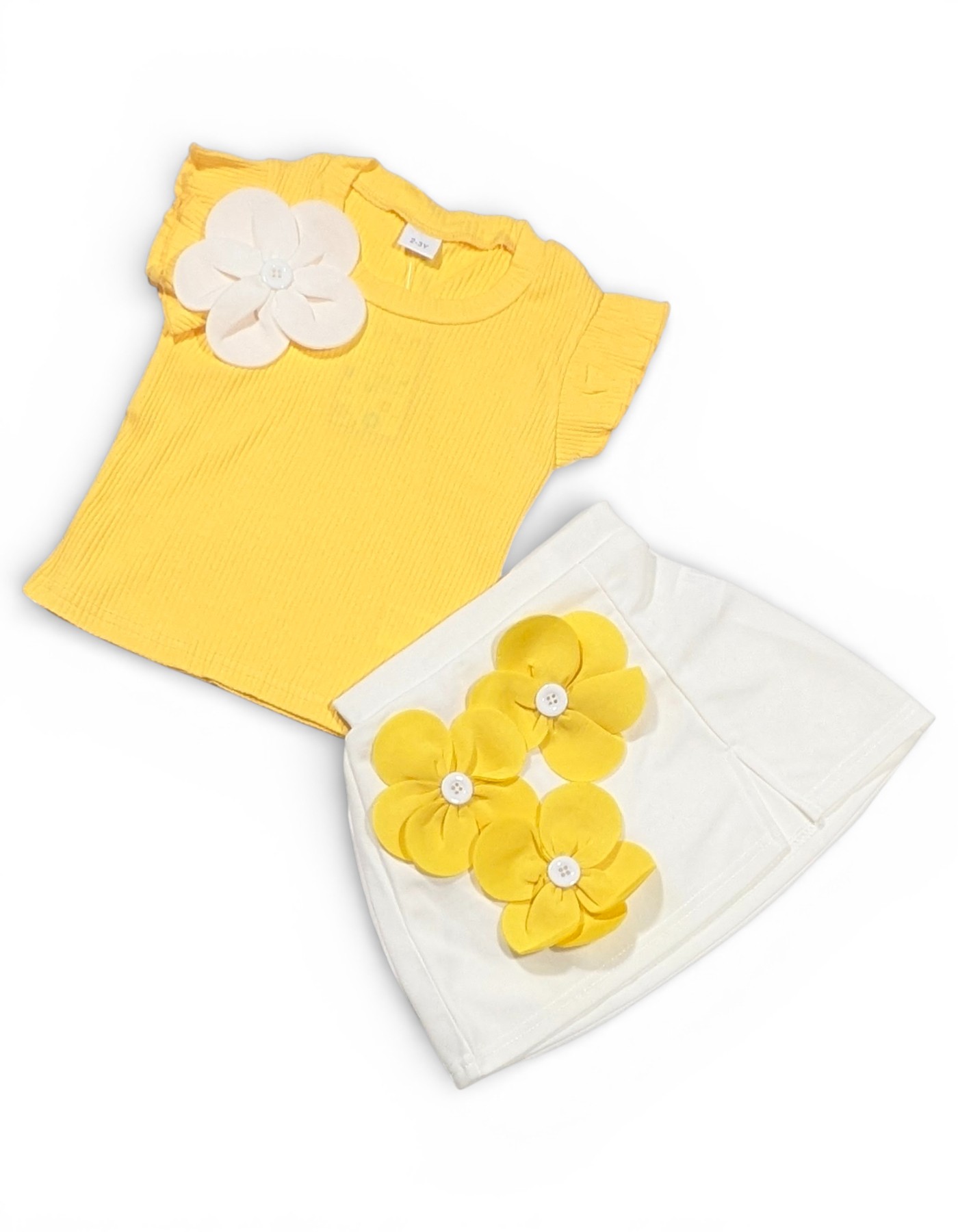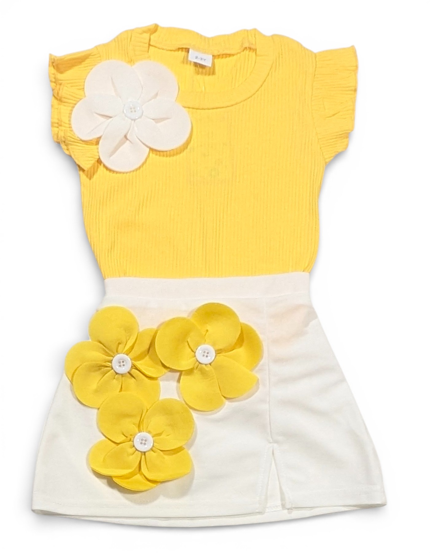 Product Description: Brighten up your little girl’s wardrobe with this charming and stylish 2-piece outfit. This beautiful set features a soft ribbed yellow top with cute ruffled sleeves and a delicate flower applique on the shoulder, adding a playful yet elegant touch. It is paired with a trendy cream skirt adorned with eye-catching 3D floral appliques, creating a fresh and cheerful look perfect for any occasion.