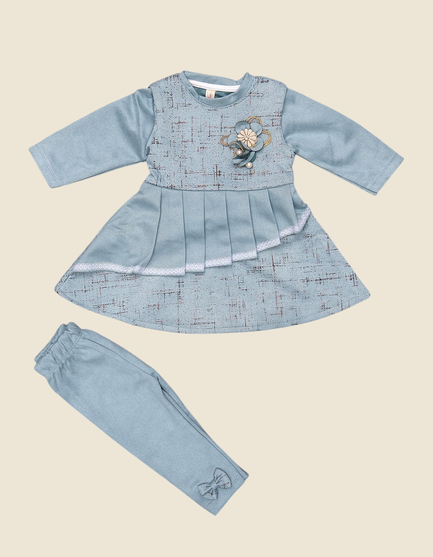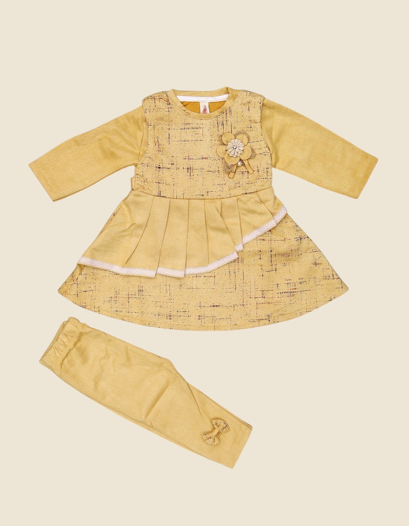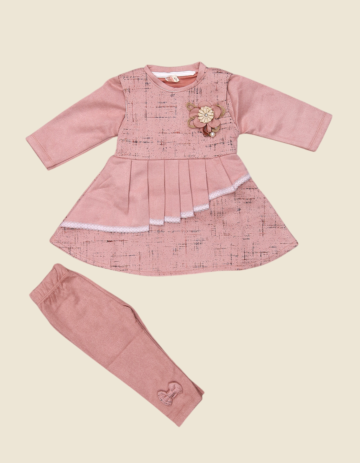 The Girls Pleated Charm Frock Suit is a graceful 2-piece outfit designed for a stylish yet comfortable look. The frock features elegant pleated detailing, a floral applique with pearl accents, and delicate lace trim at the hem. Paired with matching leggings adorned with a cute bow accent, this set offers a perfect blend of fashion and comfort. Available in Ferozi, Mustard, and Pink, this outfit is ideal for parties, festive occasions, or family gatherings, ensuring your little girl looks charming and confident.