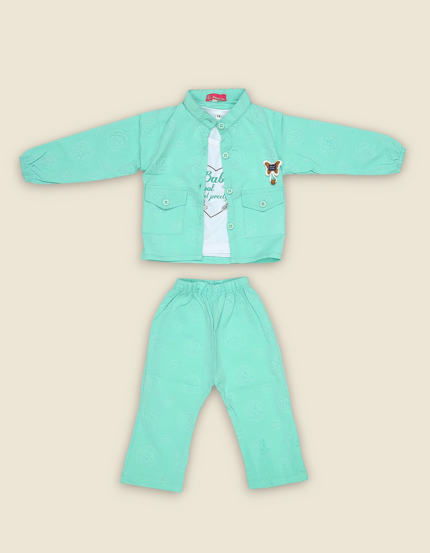 Stylish girls suit with floral jacket matching pants and soft inner shirt. Perfect for winter wear outings and gifting