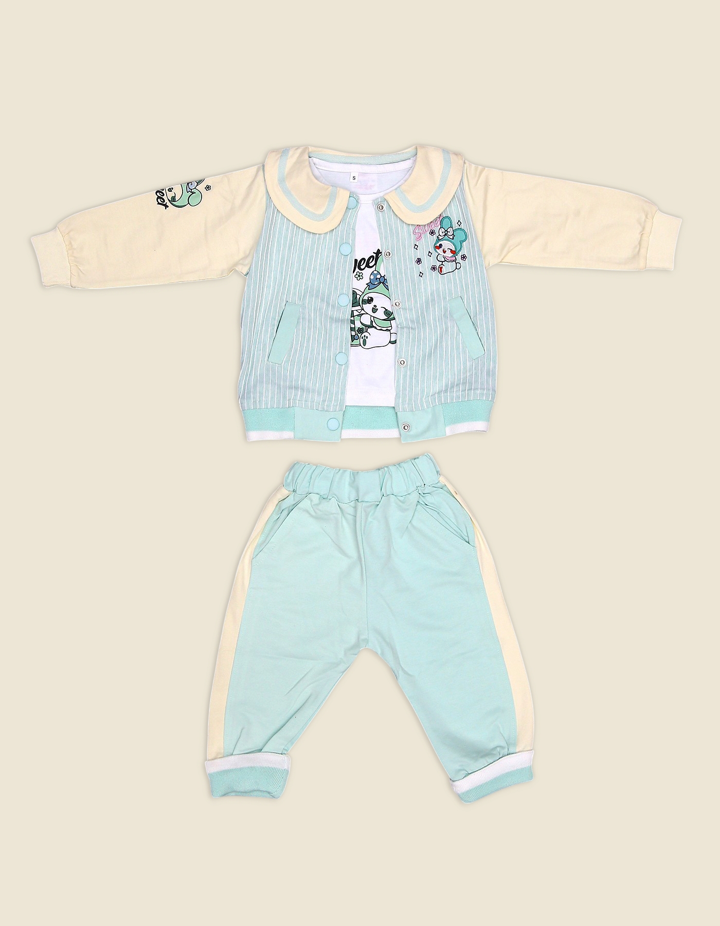 The Girls Sweet Bunny Suit is an adorable 3-piece outfit featuring a striped button-down jacket with cartoon bunny prints, a matching inner T-shirt, and comfy jogger-style pants with contrast side panels. The jacket comes with a Peter Pan collar and front pockets for a stylish, playful touch, while the pants ensure comfort with an elastic waistband and cuffed hems. Available in Baby Pink, Green, and Peach, this outfit is perfect for casual wear, playdates, and outings, keeping your little one both cute and comfortable.