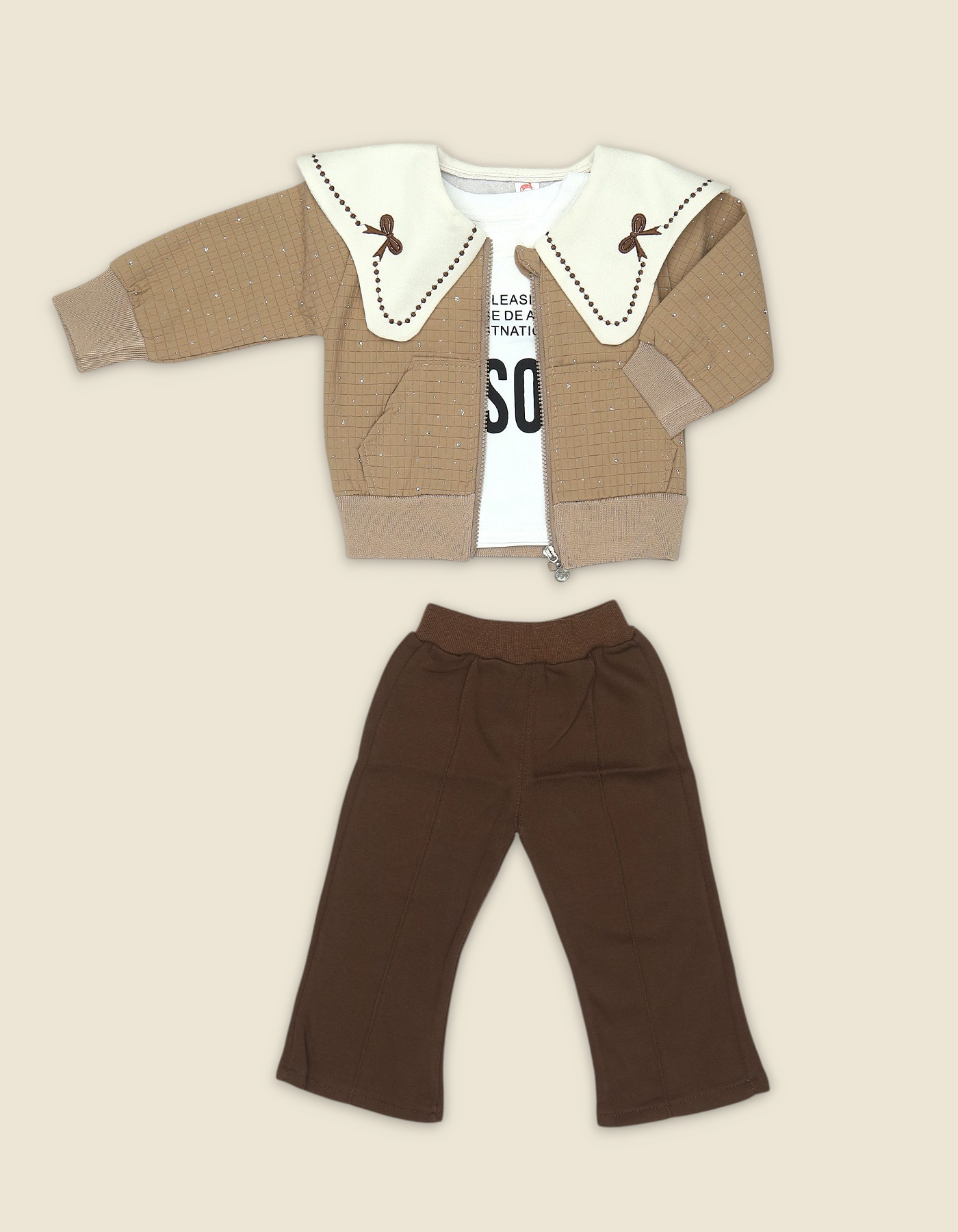 Elegant three piece girls outfit including zip-up jacket, inner shirt and pants. Designed with a sailor-style collar, ribbon bows and soft fabric for a stylish and comfortable look.