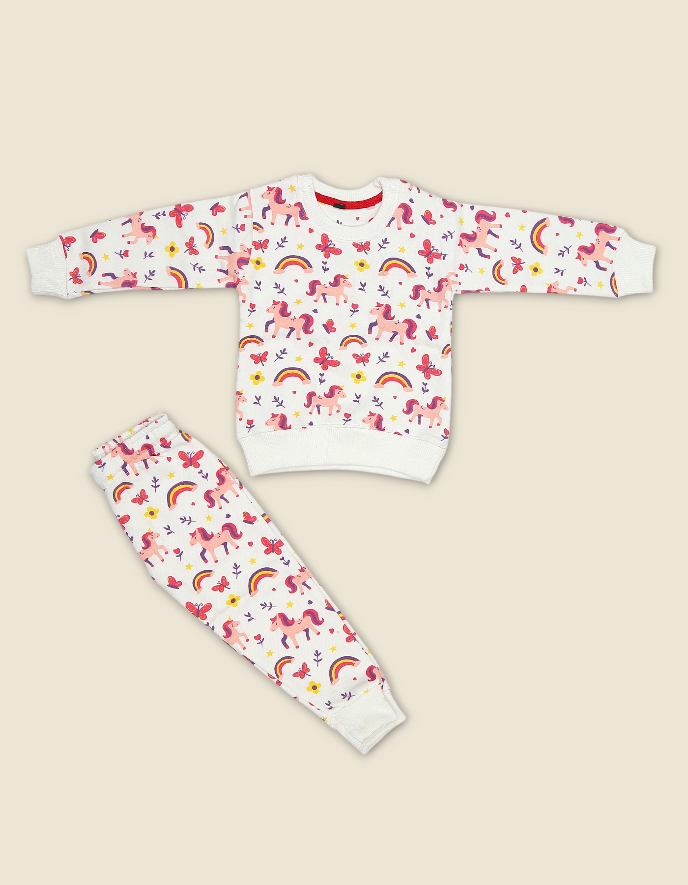Playful girls track suit with unicorn and rainbow print. Perfect for sleepwear playtime and gifting